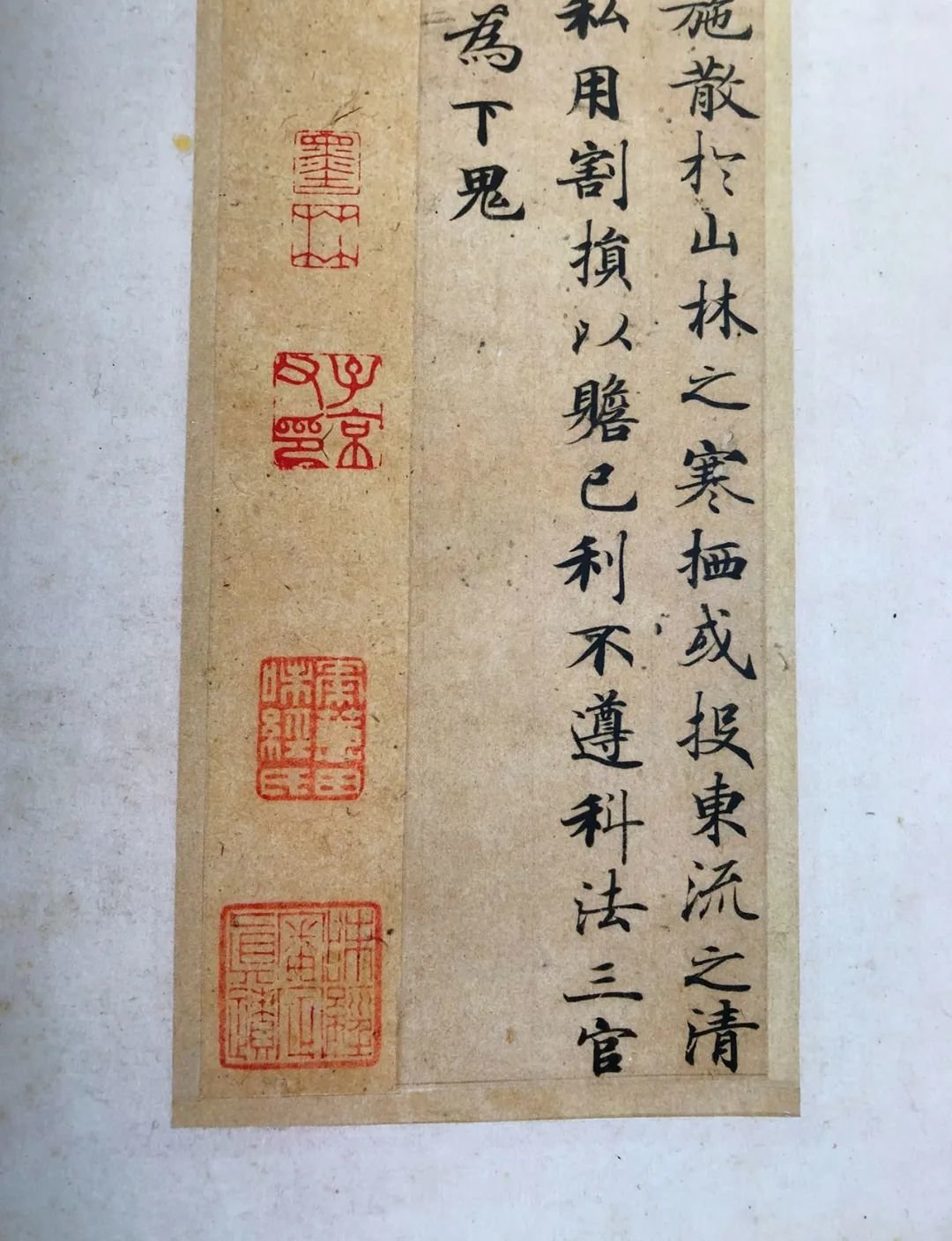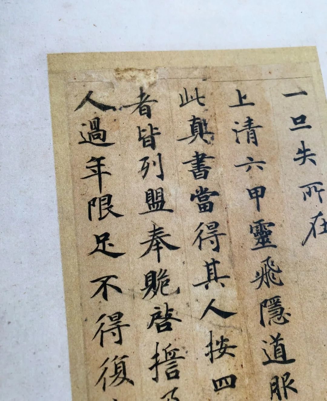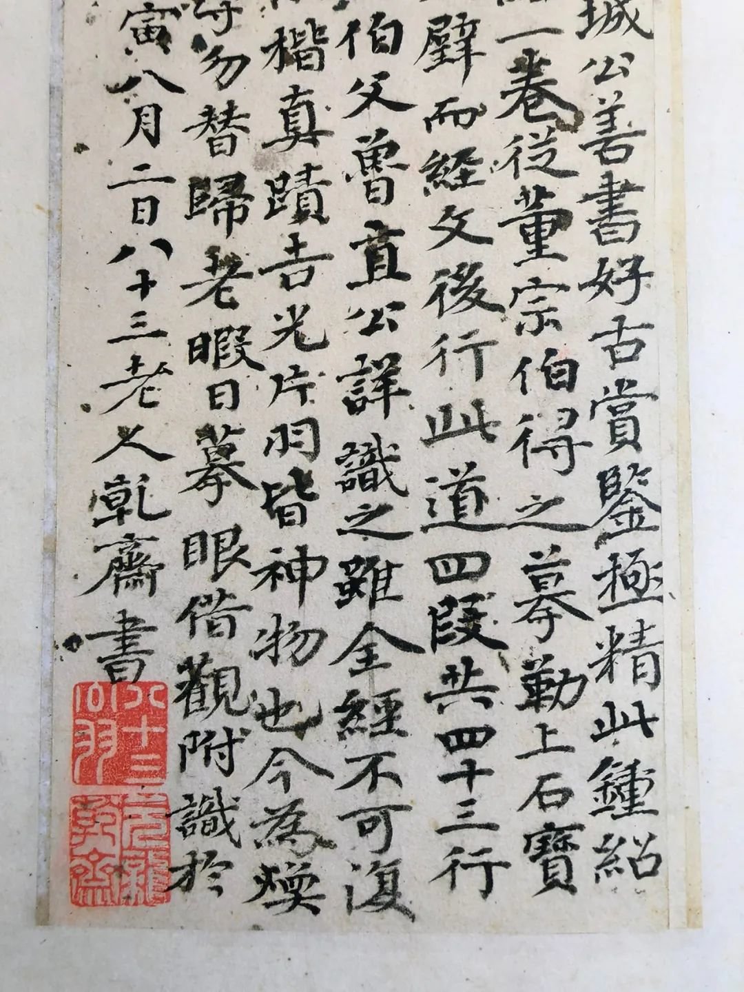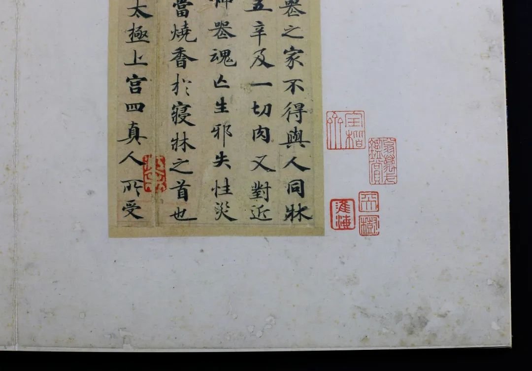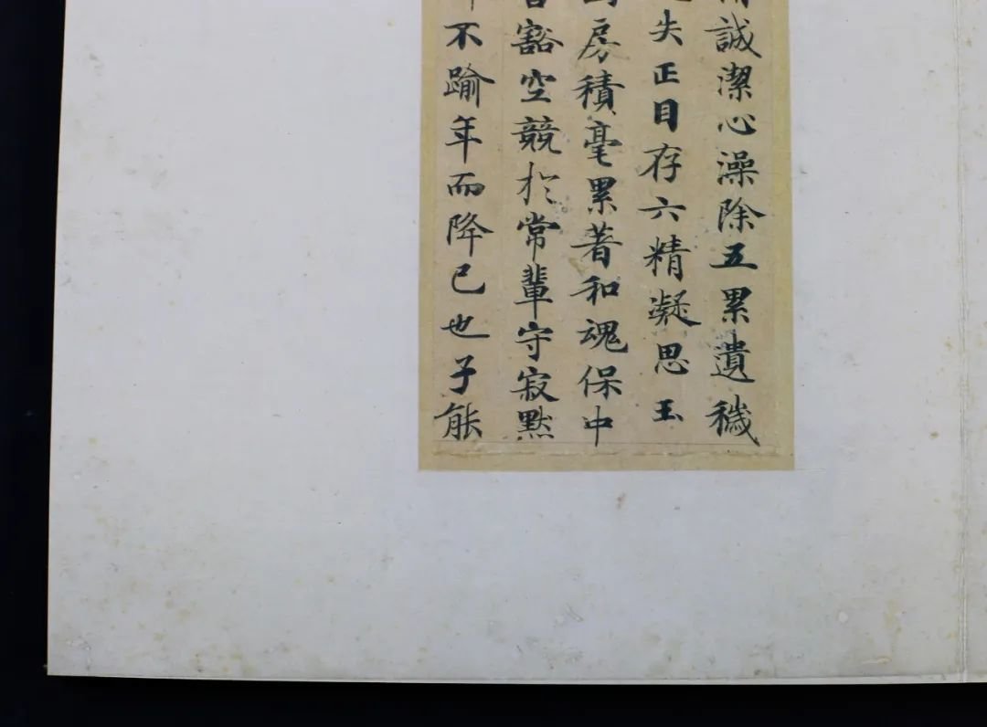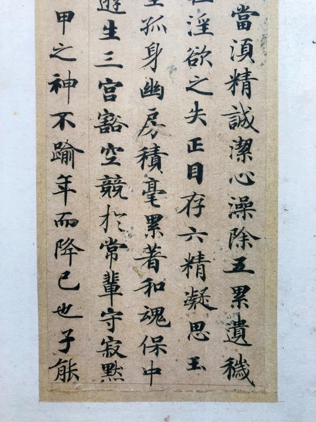 今日从文献上来探讨此唐人所写《灵飞经》,主要是根据《渤海》所刻。然而,《渤海》所刻相对于当日董氏所藏全卷而言,很可能只是选刻,而非全刻。这一问题不能在此简介中展开,只提二点:第一、以《渤海》所刻较此陈氏所截留之四十三墨迹,墨迹之末十二行即为《渤海》所阙;第二、清初人顾复所著《平生壮观》卷一曾详细著录了他所见到的《灵飞经》写卷,与《渤海》所刻显系一物,而规模却远超《渤海》所刻。