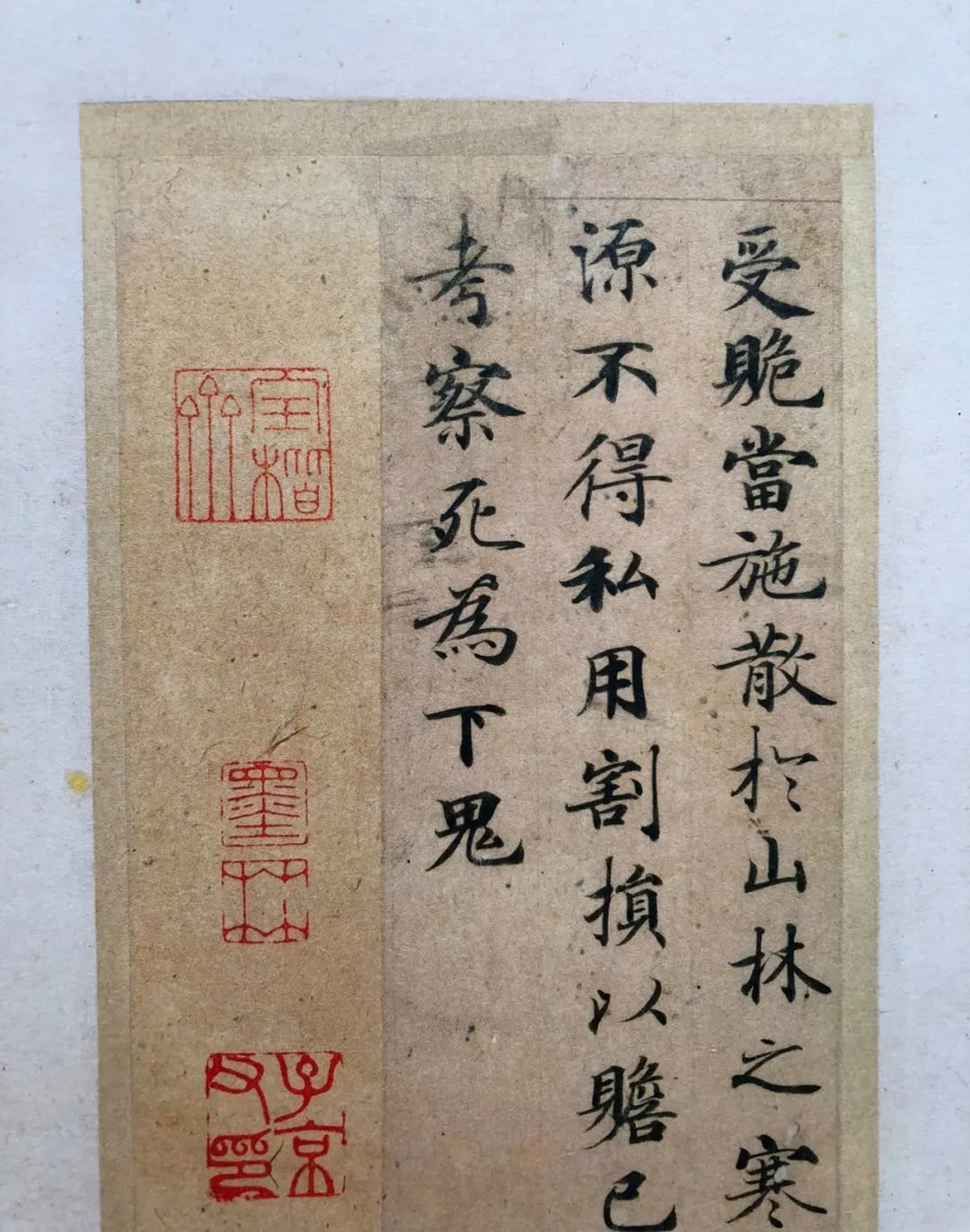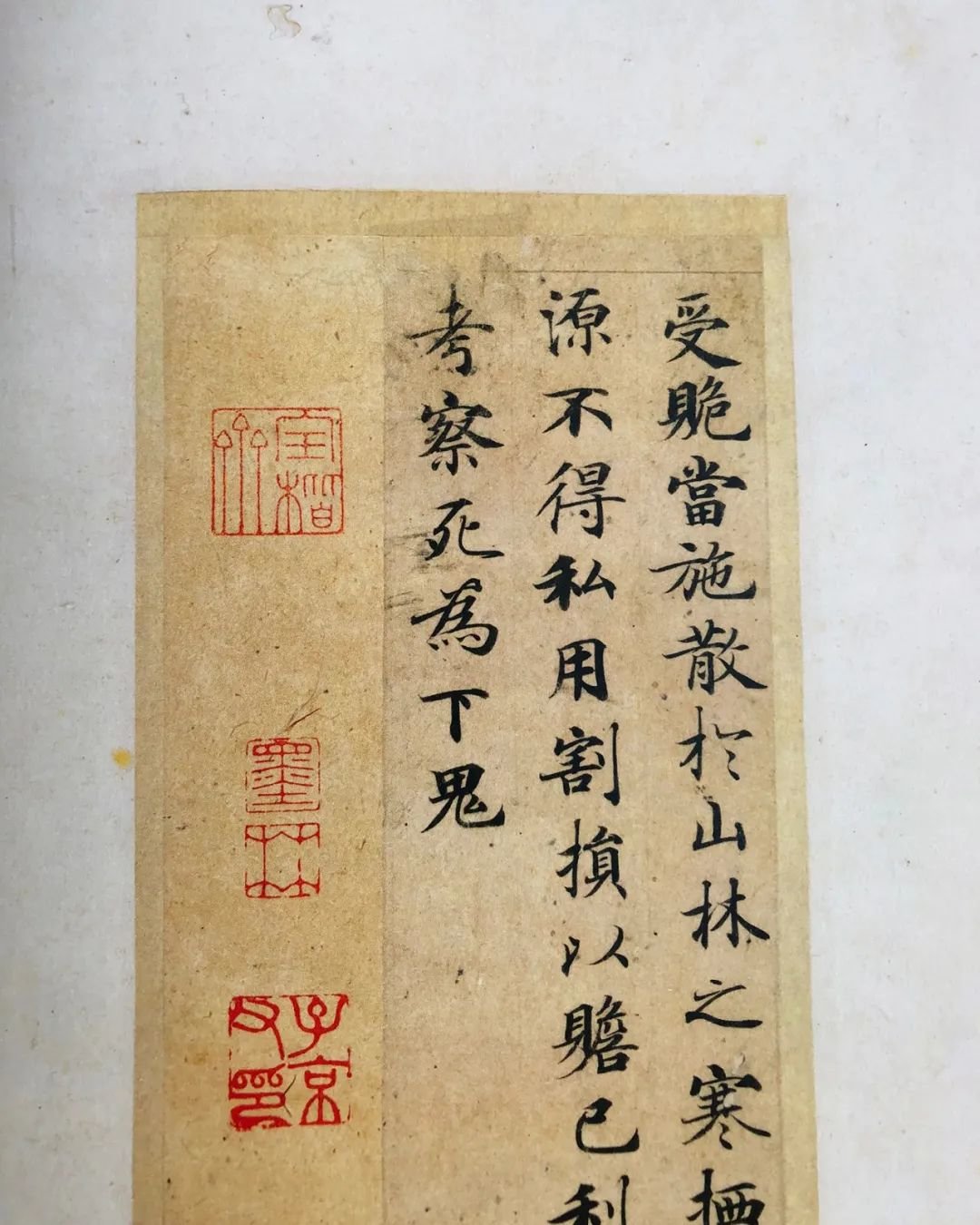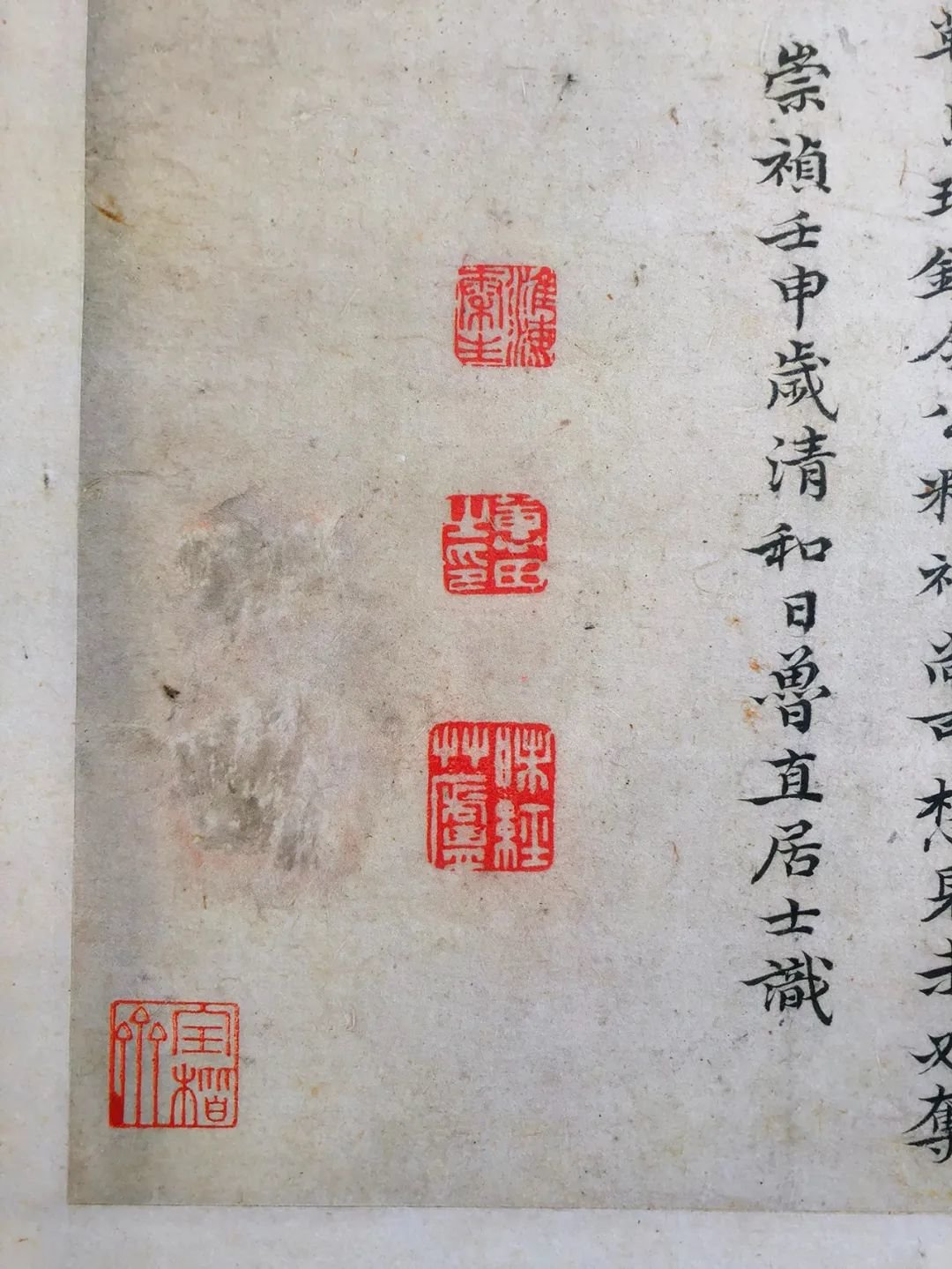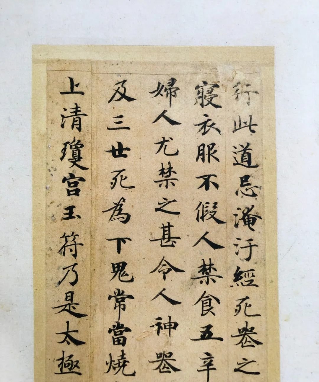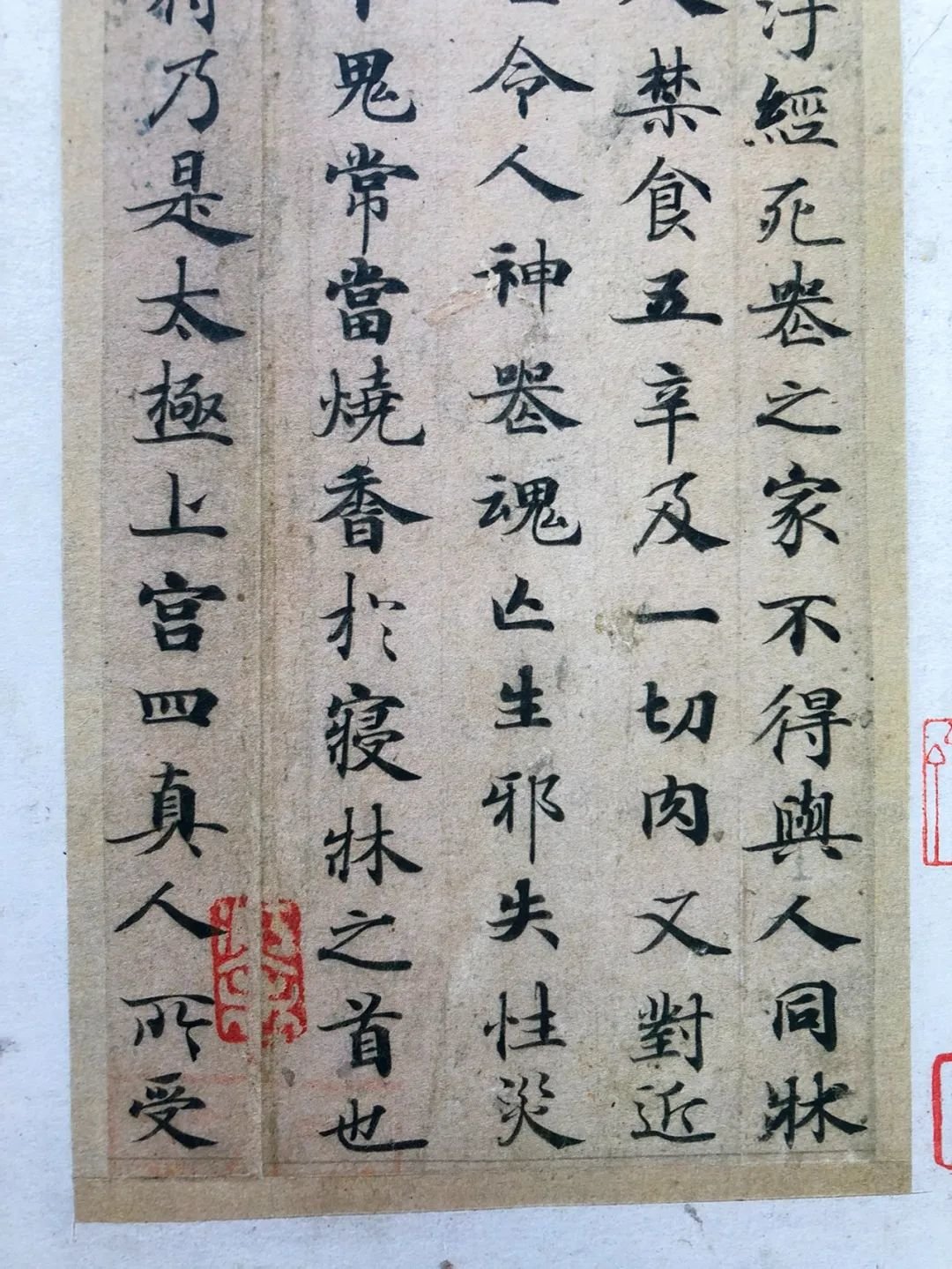 今日从文献上来探讨此唐人所写《灵飞经》,主要是根据《渤海》所刻。然而,《渤海》所刻相对于当日董氏所藏全卷而言,很可能只是选刻,而非全刻。这一问题不能在此简介中展开,只提二点:第一、以《渤海》所刻较此陈氏所截留之四十三墨迹,墨迹之末十二行即为《渤海》所阙;第二、清初人顾复所著《平生壮观》卷一曾详细著录了他所见到的《灵飞经》写卷,与《渤海》所刻显系一物,而规模却远超《渤海》所刻。