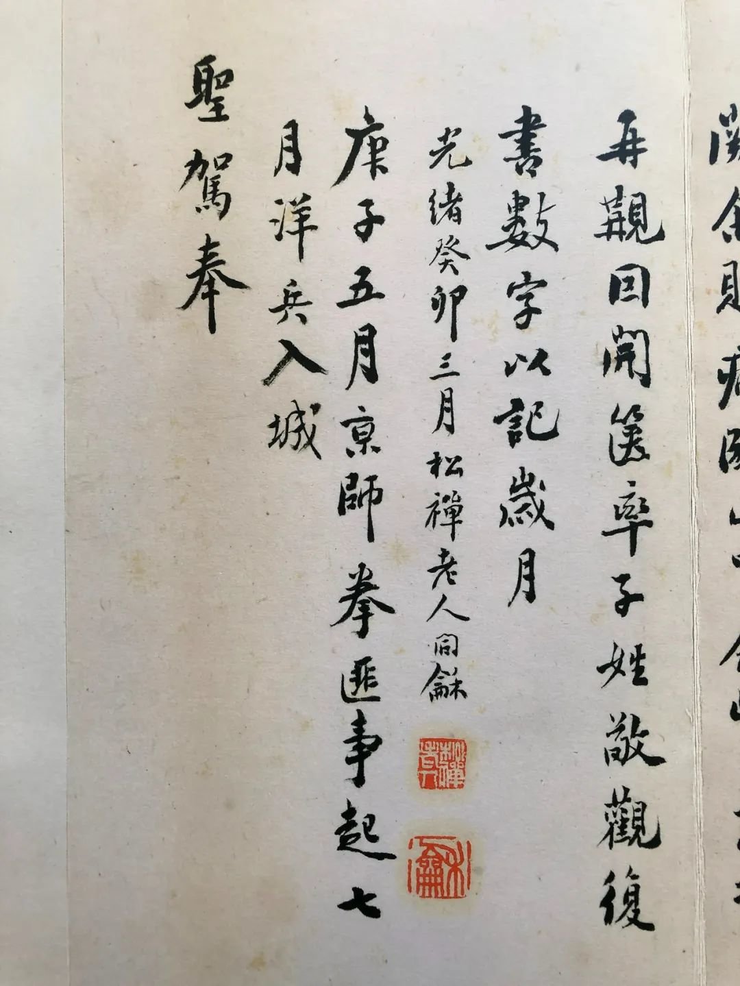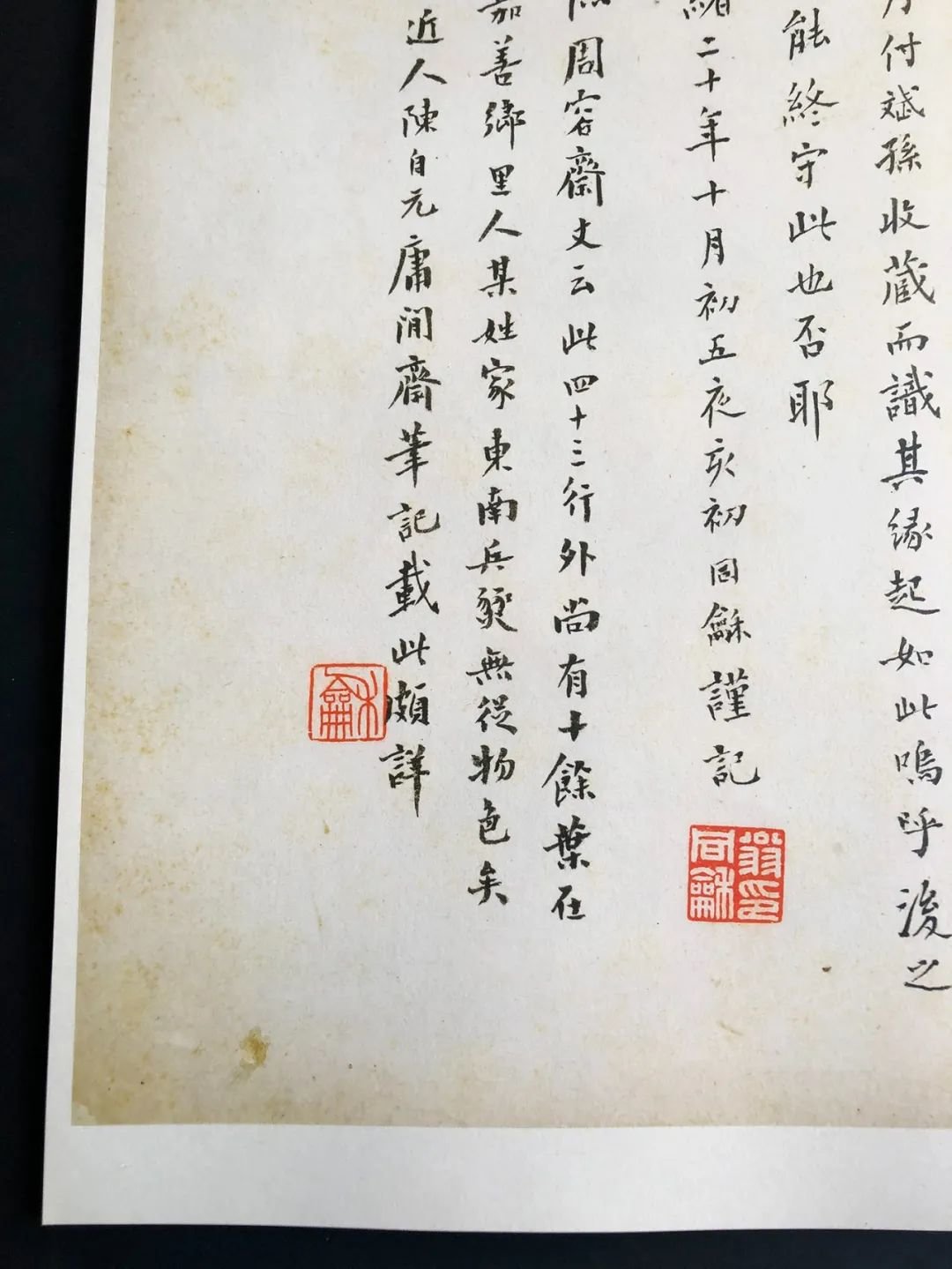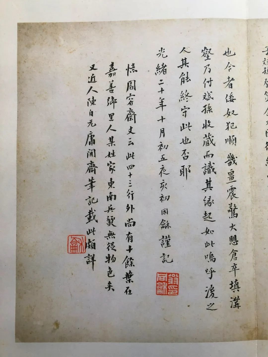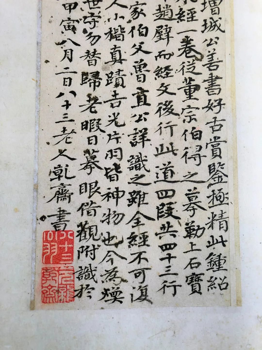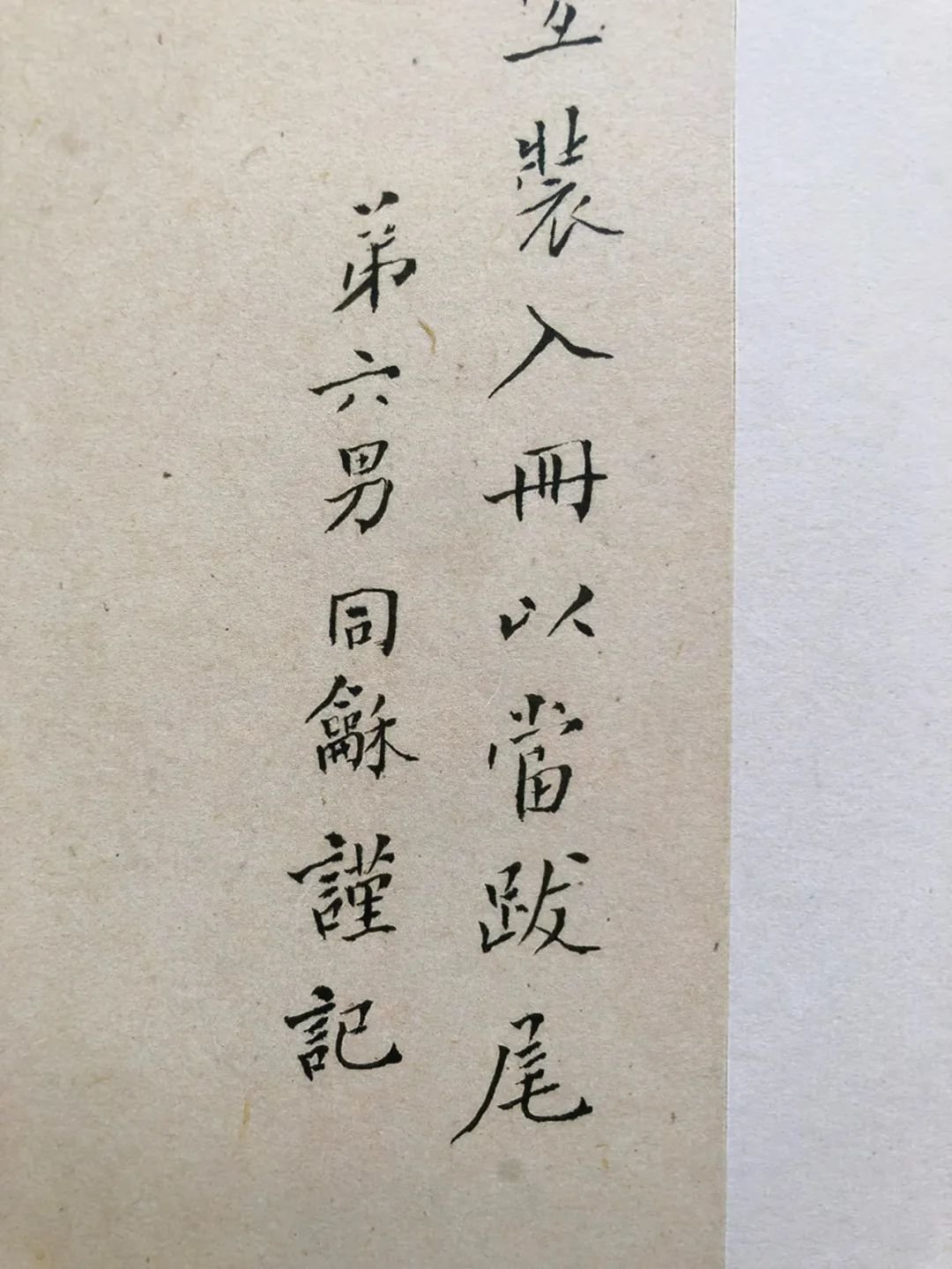 此四十三行在吴氏手时,嘉善枫泾(今属上海)人谢恭铭曾借刻入《望云楼法帖》。嘉庆十六年(一八一一)钱泳过枫泾镇,于谢氏斋中得观此四十三行墨迹,后详记于《履园丛话》卷十中。谢氏借刻之后,似乎未再归还,此与当年董、陈故事相类。后来道光十五年(一八三五)此四十三行墨迹又转归常熟翁心存收藏,翁氏即得之于谢氏后人。后心存又传其子同龢。翁同龢于此册再三题跋,颇寓个人身世家国之感怆,而且还抄录了董其昌两通关于此唐人写《灵飞经》的书信。此后该册便一直收藏于翁氏家族,直至翁万戈将此册转让于大都会艺术博物馆。大约在翁氏手中时此册又重装一过,翁心存抄录的《履园丛话》条目及翁同龢的数通题跋都被装入册中。