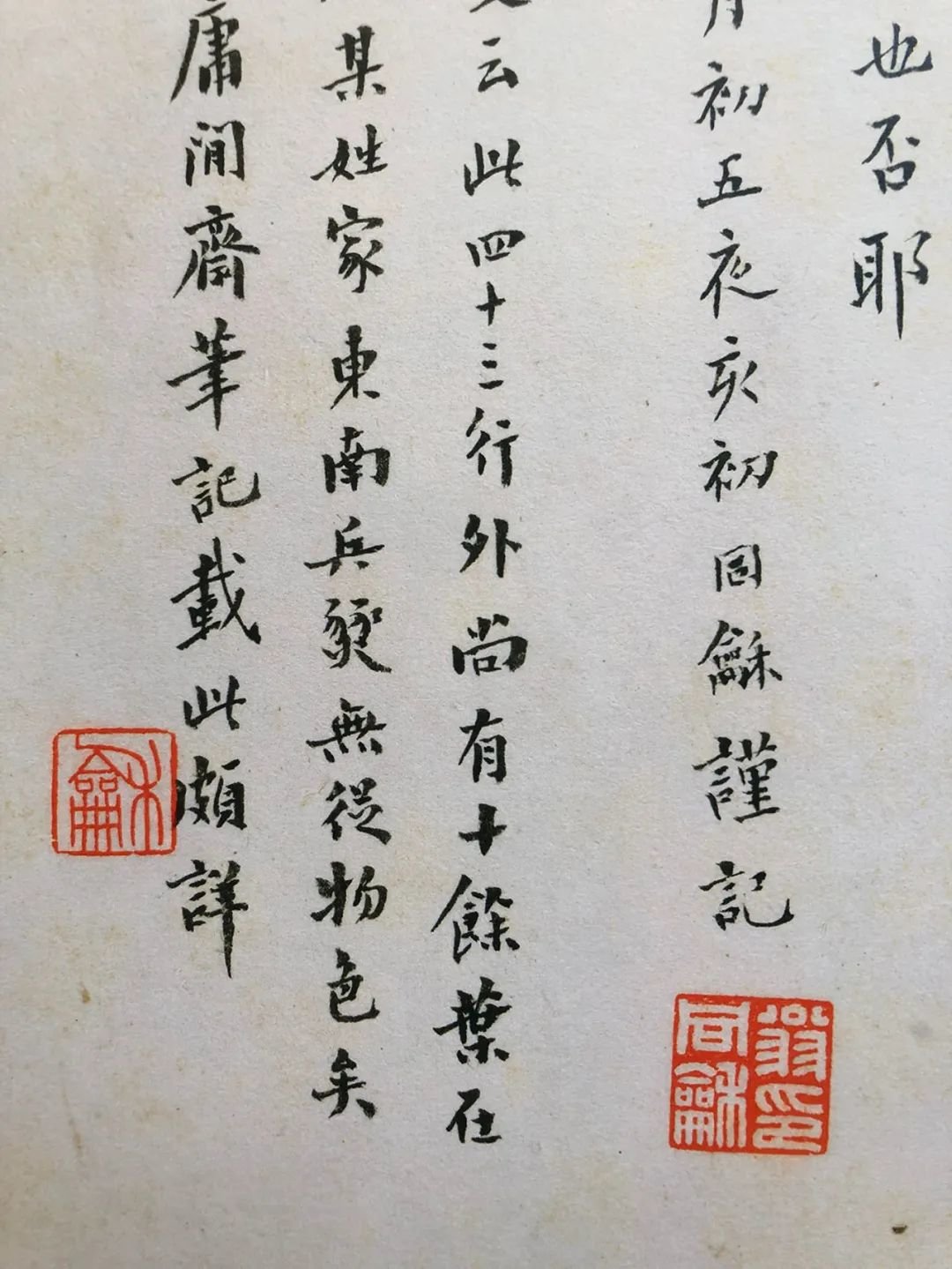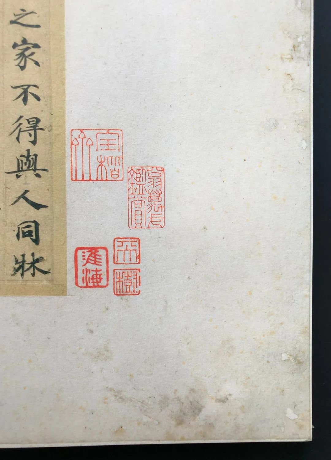 四十三行墨迹为陈瓛、陈之伸父子截留后,后来又为其同族后人陈璵收藏,即陈元龙、陈世倌二跋中称作“焕若”者。陈璵已是乾隆时人,与陈瓛、陈之伸虽同是海宁陈氏,但服属已远。璵又传其子陈用敷。陈用敷曾以之赠与其师秦蕙田,是以是册中有秦氏诸收藏印记。秦氏卒后,陈用敷复以计赚归。陈用敷卒于嘉庆四年(一七九九),然至嘉庆十年(一八〇五)吴骞作跋时,仍称“观玉箴主人藏灵飞经真迹”,是知此四十三行仍在陈氏后人手中(该诗又收在《拜经楼诗集续编》卷三,题作“观陈氏玉箴堂旧藏钟可大书灵飞经残一题后效半格体”,玉箴堂为海宁陈宅之堂名,乃陈诜时康熙御赐题名)。然再过五年,即嘉庆十五年(一八一〇),这四十三行墨迹已转归嘉兴人吴余山矣。