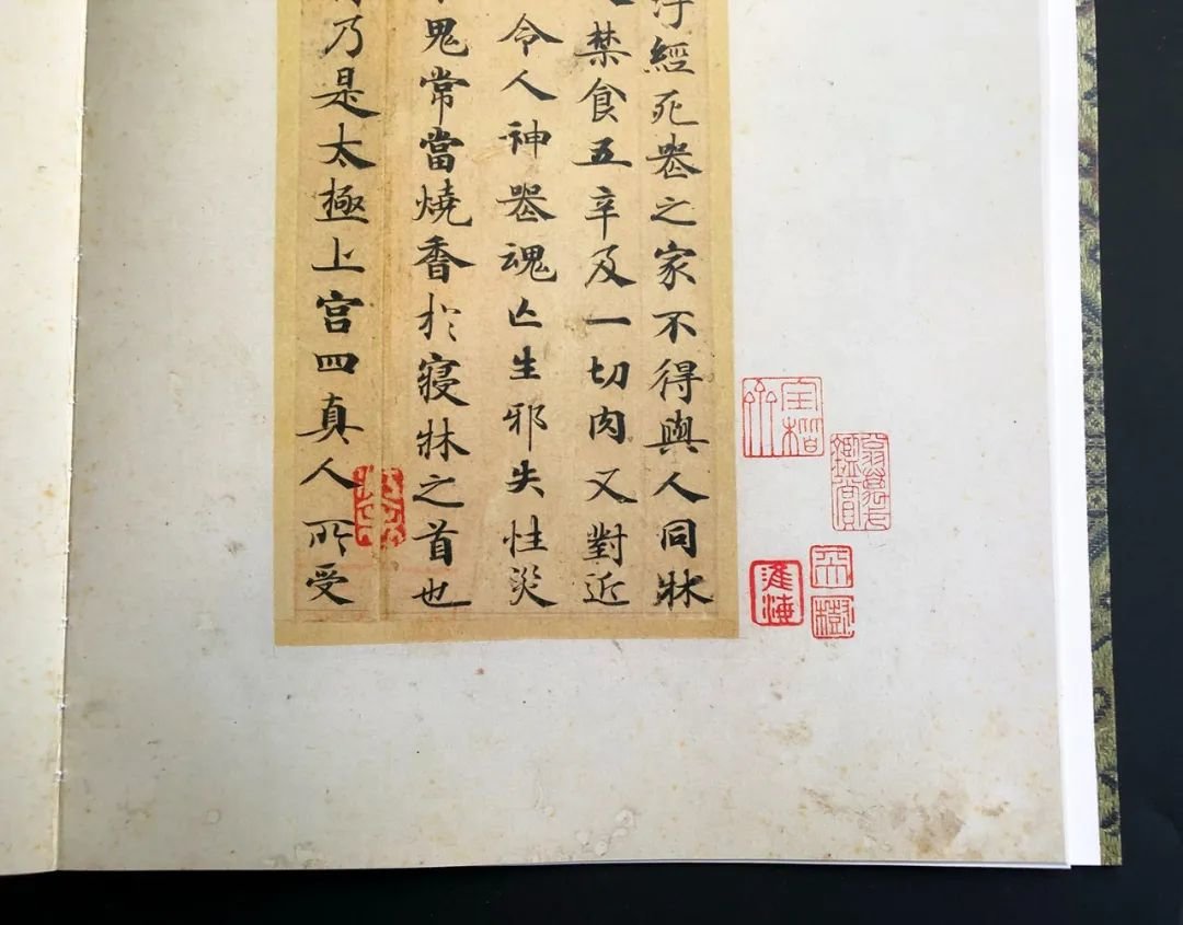 该册古锦封面,封面签条即为翁万戈手题:“唐人灵飞经真迹四十三行”,款署“戊辰夏日”,当是一九八八年。册内总计二十二开,其中唐人写经墨迹四十三行五开;经前两开,有签条四,并清人吴余山手写目录一纸;经后十五开,依次是:董其昌手札三开,紫芝老人、鲁直居士、陈元龙、陈世倌题跋四开,吴骞题跋一开,翁心存手抄钱泳《履园丛话》相关条目三开、翁同龢题跋四开。前后收藏印记有“淮海”“天树”“宝楷斋”“翁万戈鉴赏”“味经审定真迹”“秦蕙田味经氏”“子京父印”“墨林”“玉堂清暇”“太生”“铭心绝品”“余山珍秘”“味经草庐”“蕙田之印”“淮海秦生”“金匮秦蕙田味经氏图书”等。
