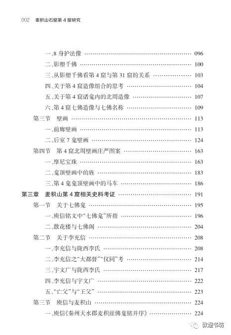 庾信的文学作品既有文学性,又有纪实性。庾信注重对麦积山实景的描写,用华丽的文学语言和典故盛赞麦积山的景观,也用纪实性的语言赞美功德主李充信通过造七佛龛的行为彰显其孝道。但庾信的作品不是功德记,与我们习见的北朝时期的造像记或更晚时期的功德碑最大的不同是,其没有从李充信的心理角度去写。李充信作为佛教信徒,其造窟的目的和真正的心中所愿,往往不是单一的,而是复杂的。但我们从七佛龛的造像组合来看,李充信对于先祖的追念胜于自己对未来的希冀。过去七佛的雕造基本上完成了其最大的心愿,至于未来是否能够随弥勒下生,并没有考虑在造像中体现出来。这也开创了中国七佛造像的新形式,应该是一个里程碑式的转变,并影响到麦积山北周和隋代七佛造像的基本格局。这一点在第四章“第4窟的造像思想”和第七章“第4窟对麦积山石窟的影响”都有精辟的论述和讨论。