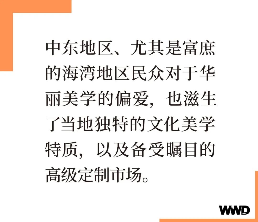 除此之外,中东地区、尤其是富庶的海湾地区民众对于华丽美学的偏爱,也滋生了当地独特的文化美学特质,以及备受瞩目的高级定制市场。