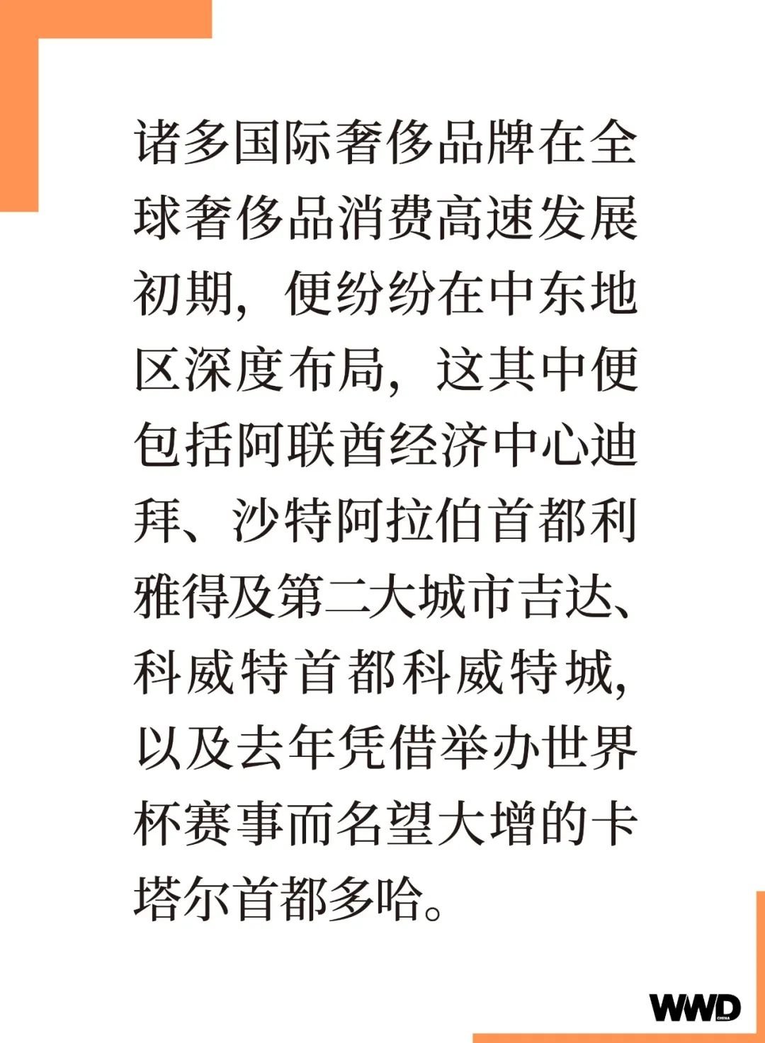同时,这些以君主制为特色的国家不乏王室、贵族及富商族群,其与生俱来的超凡购买力让这里的奢侈品消费拥有天生丰沃的环境基础。因此,诸多国际奢侈品牌在全球奢侈品消费高速发展初期,便纷纷在中东地区深度布局,这其中便包括阿联酋经济中心迪拜、沙特阿拉伯首都利雅得及第二大城市吉达、科威特首都科威特城,以及去年凭借举办世界杯赛事而名望大增的卡塔尔首都多哈。