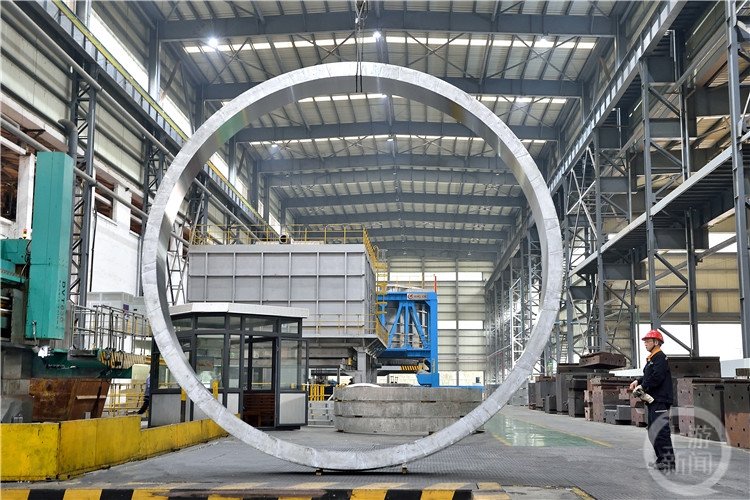△西南铝锻造厂员工在吊运直径3.5米铝合金锻环。