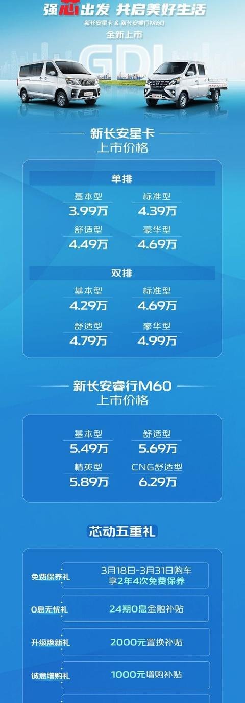 在创富者的瞩目中,两款新车正式上市。其中,新生代强动力微卡-新长安星卡官方指导价3.99万元起,强动力宽体大微客-新长安睿行M60官方指导价5.49万元起。