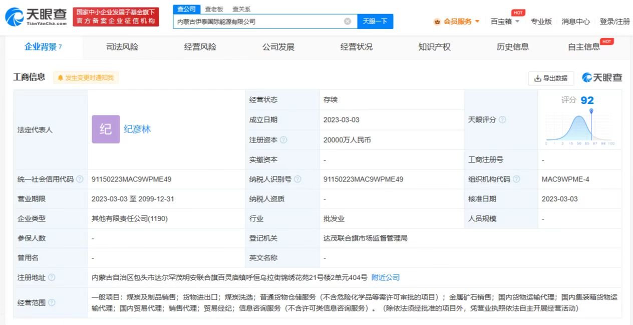 鞭牛士 3月22日消息,天眼查App显示,近日,内蒙古伊泰国际能源有限公司成立,法定代表人为纪彦林,注册资本2亿人民币,经营范围包括煤炭及制品销售;货物进出口;煤炭洗选;普通货物仓储服务;金属矿石销售;国内货物运输代理;国内集装箱货物运输代理等。