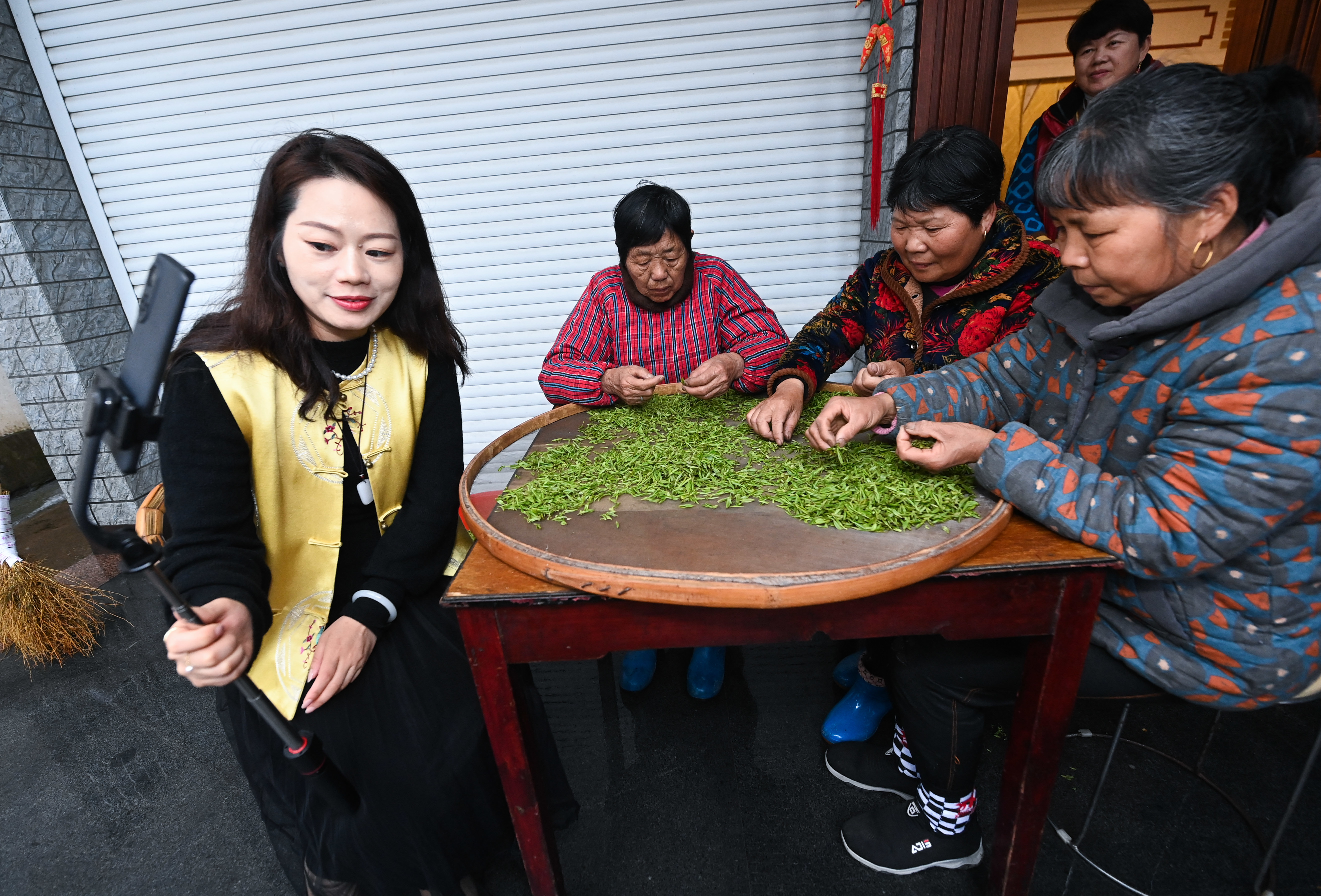 3月22日,一名女子在诸暨市赵家镇东庄村上阳自然村直播高山有机茶的制作情况,助力网上销售。新华社记者 徐昱 摄