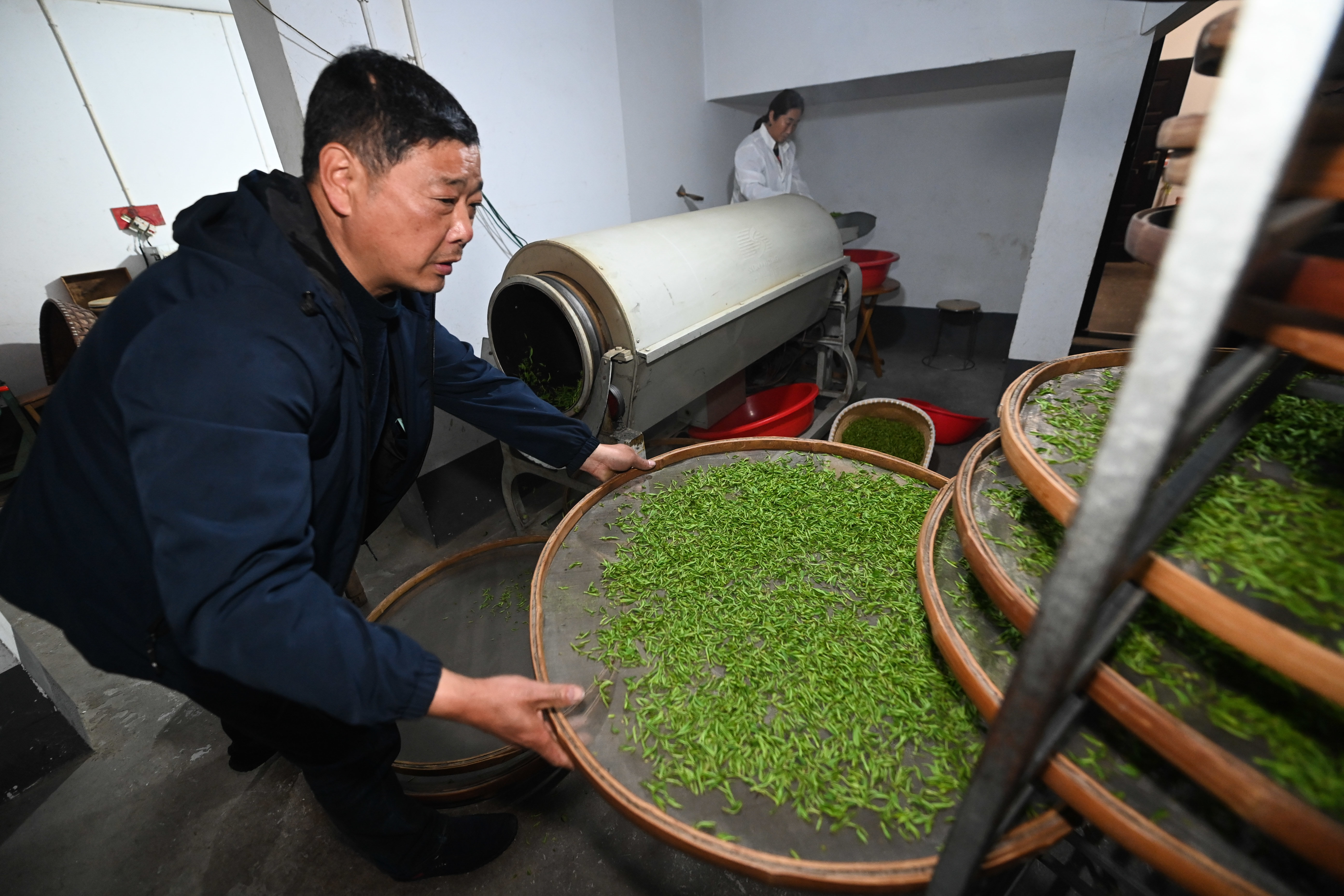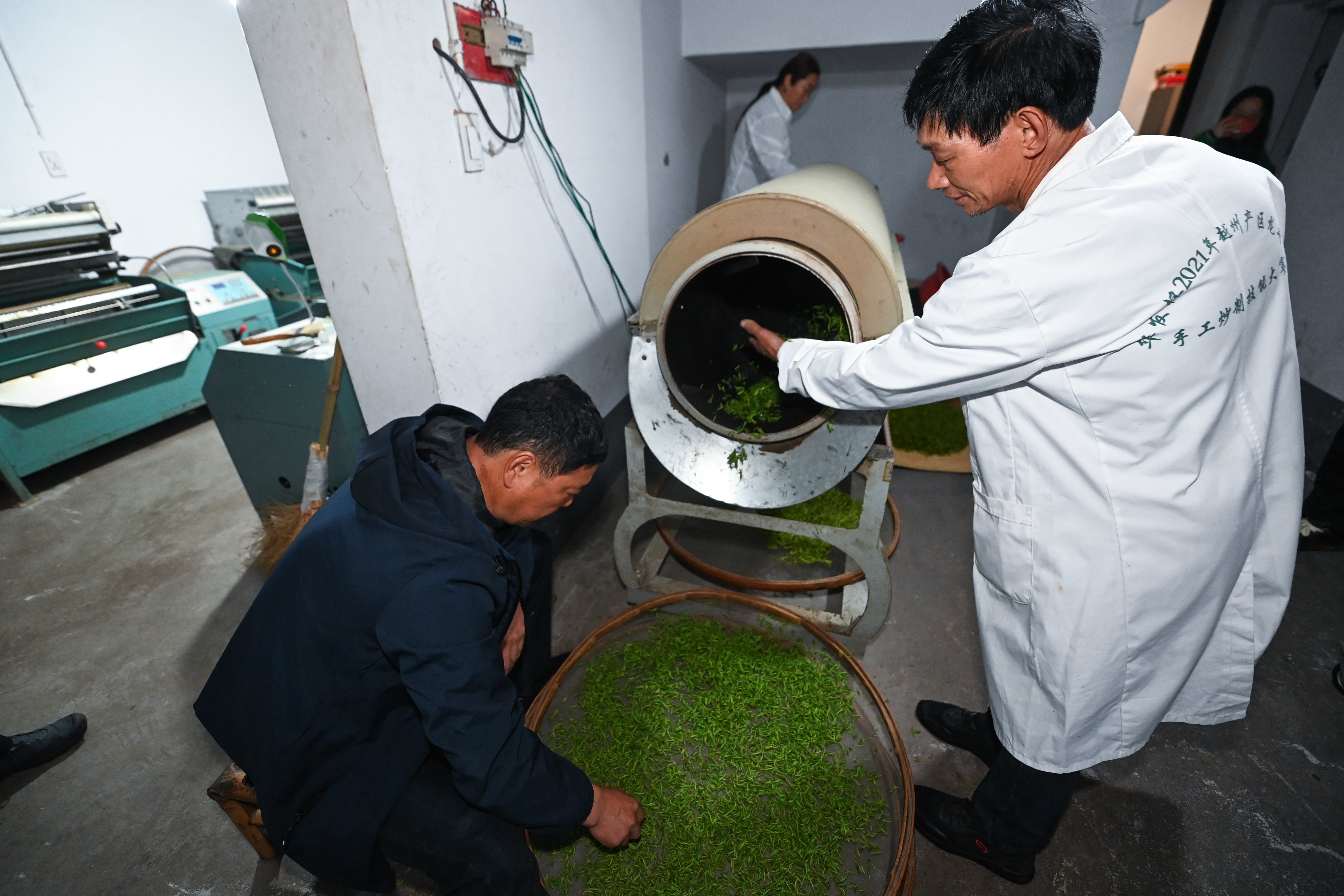 3月22日,赵家镇东庄村上阳自然村“手工茶共富工坊”的致富带头人骆煌喜(右)查看高山有机茶的炒制情况。新华社记者 徐昱 摄