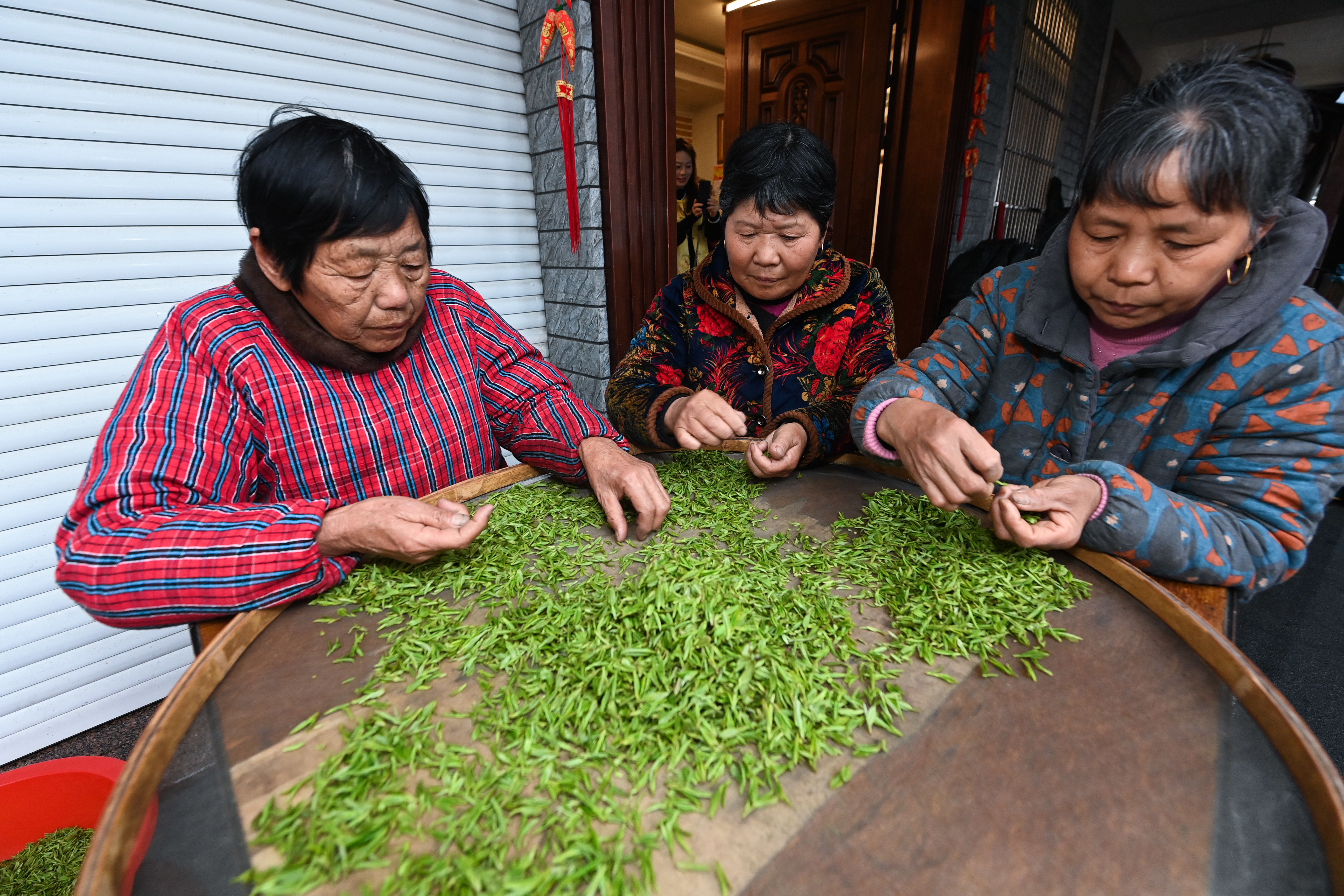 3月22日,赵家镇东庄村上阳自然村的茶农在挑选刚采摘的高山有机茶。新华社记者 徐昱 摄