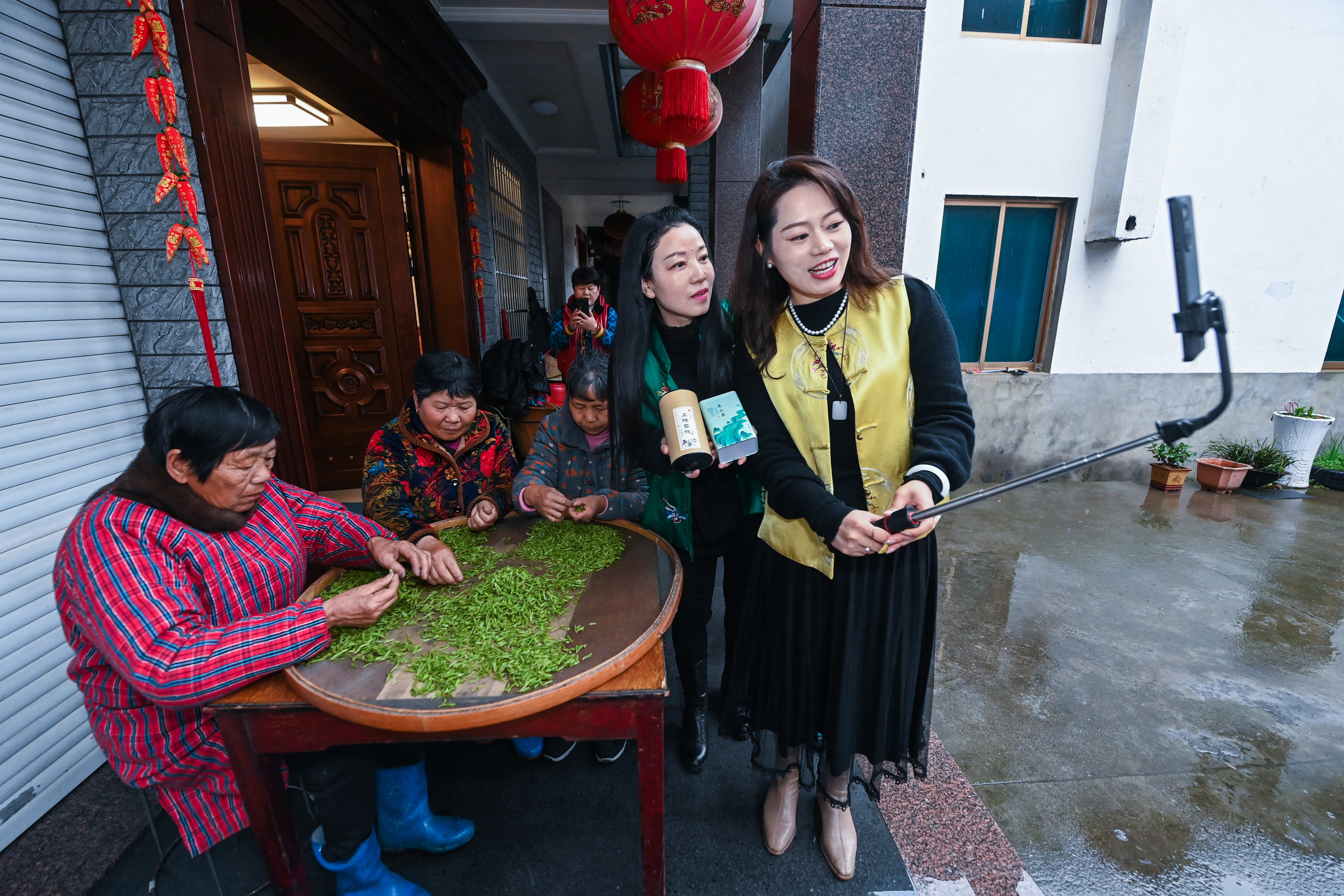 3月22日,两名女子在诸暨市赵家镇东庄村上阳自然村直播高山有机茶制作,助力网上销售。新华社记者 徐昱 摄