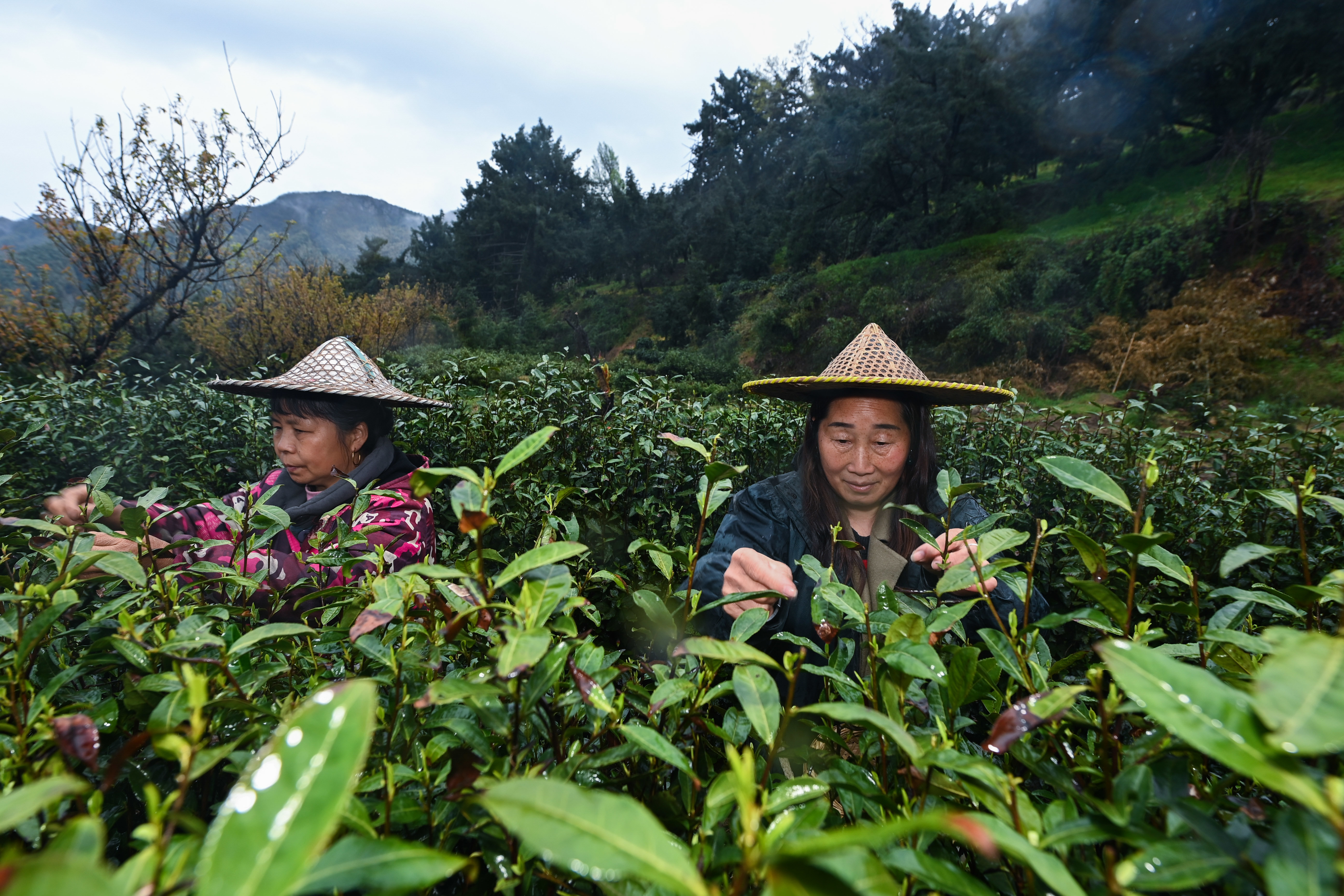 3月22日,赵家镇东庄村上阳自然村的茶农在采摘高山有机茶。新华社记者 徐昱 摄