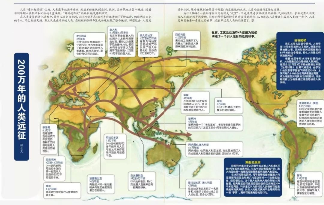 在人类漫长的进化过程中,曾经三次走出非洲,而且可能早在180万年前就开始了冒险征途,但前两次出走的古人,均已相继灭绝。第三次走出非洲的人类,在短短的20万年里成功地征服了整个地球。回望过去,人类发源于非洲,随后迁徙到世界各个角落;而在遥远的未来,人类可能进行星际大迁徙。
