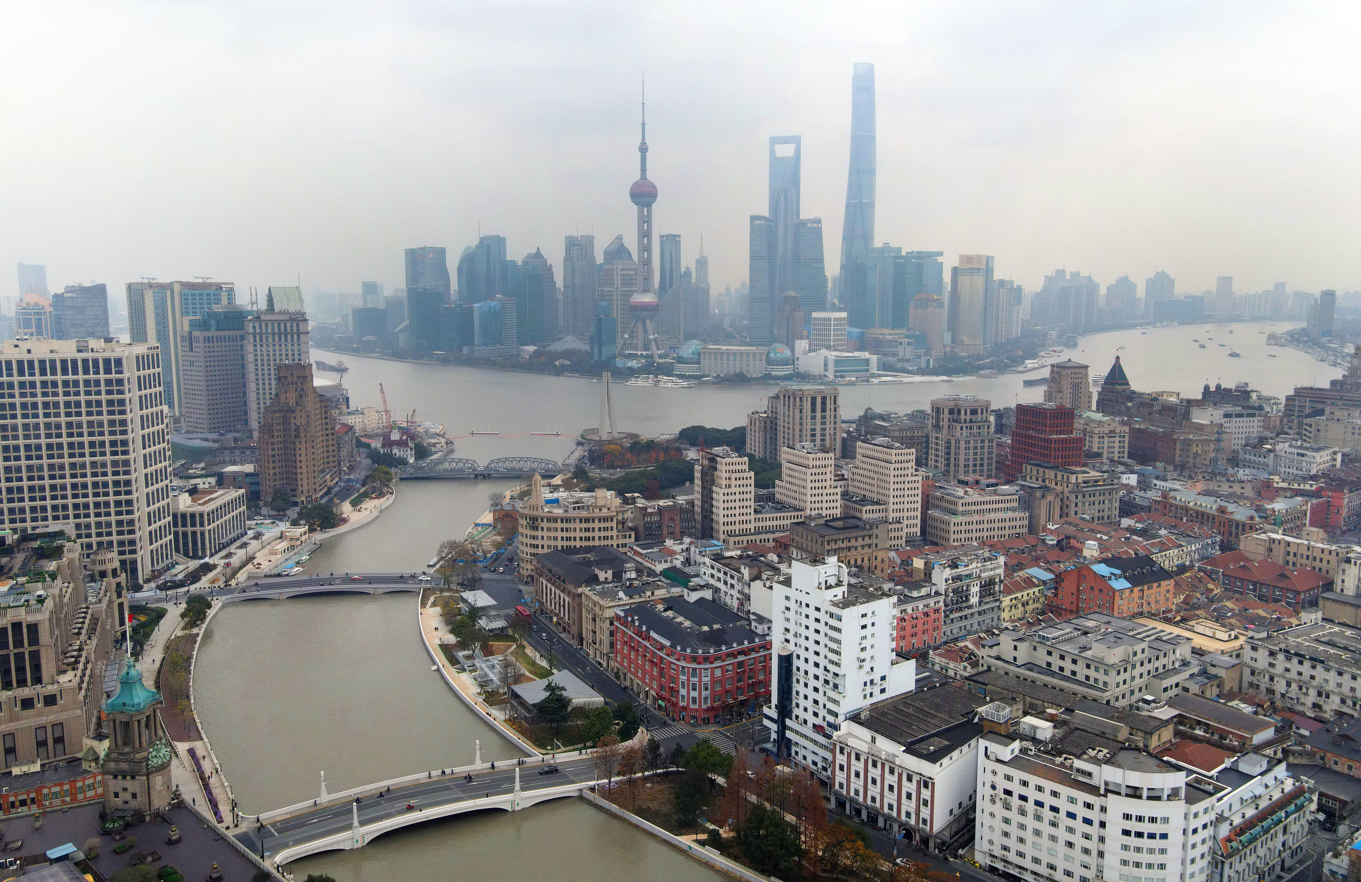 从空中俯瞰苏州河(下)与黄浦江的交汇处(2020年12月29日摄,无人机照片)。新华社记者 方喆 摄