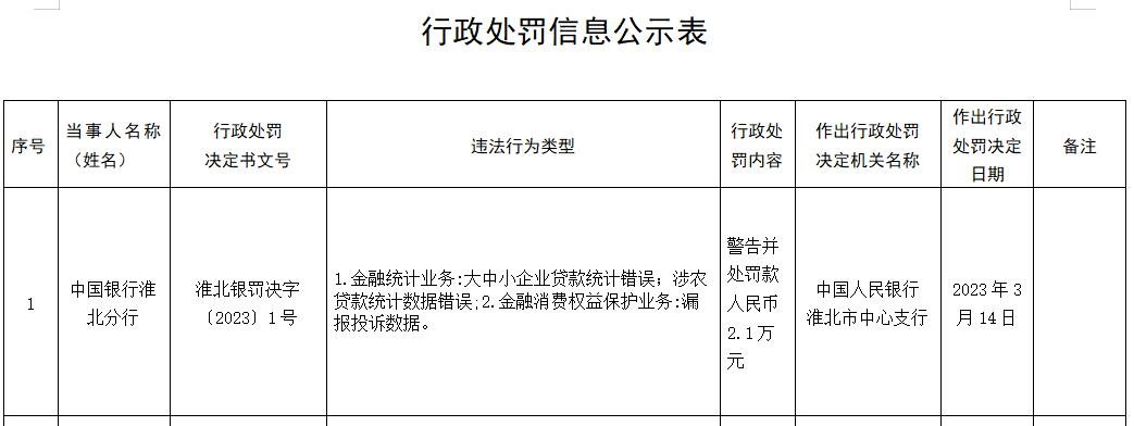 原标题:中国银行淮北分行违规被罚 大中小企业贷款统计错误等