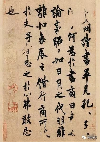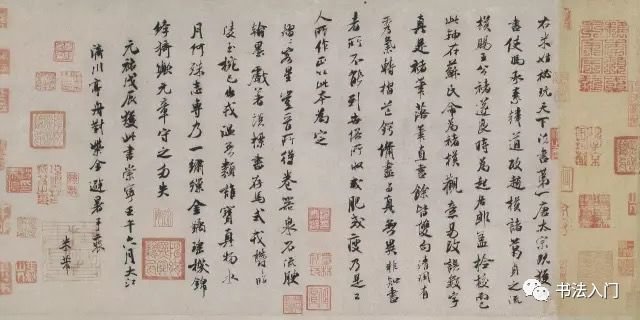 与米芾崇晋卑唐的草书观不同的是,米芾行书学习由唐入晋,崇晋融唐而不避唐,对唐代的颜、欧、段、褚等名家及魏晋法帖都普遍临学,博采众长,将晋唐笔法熔于一炉,形成了自己行书的独特风貌。