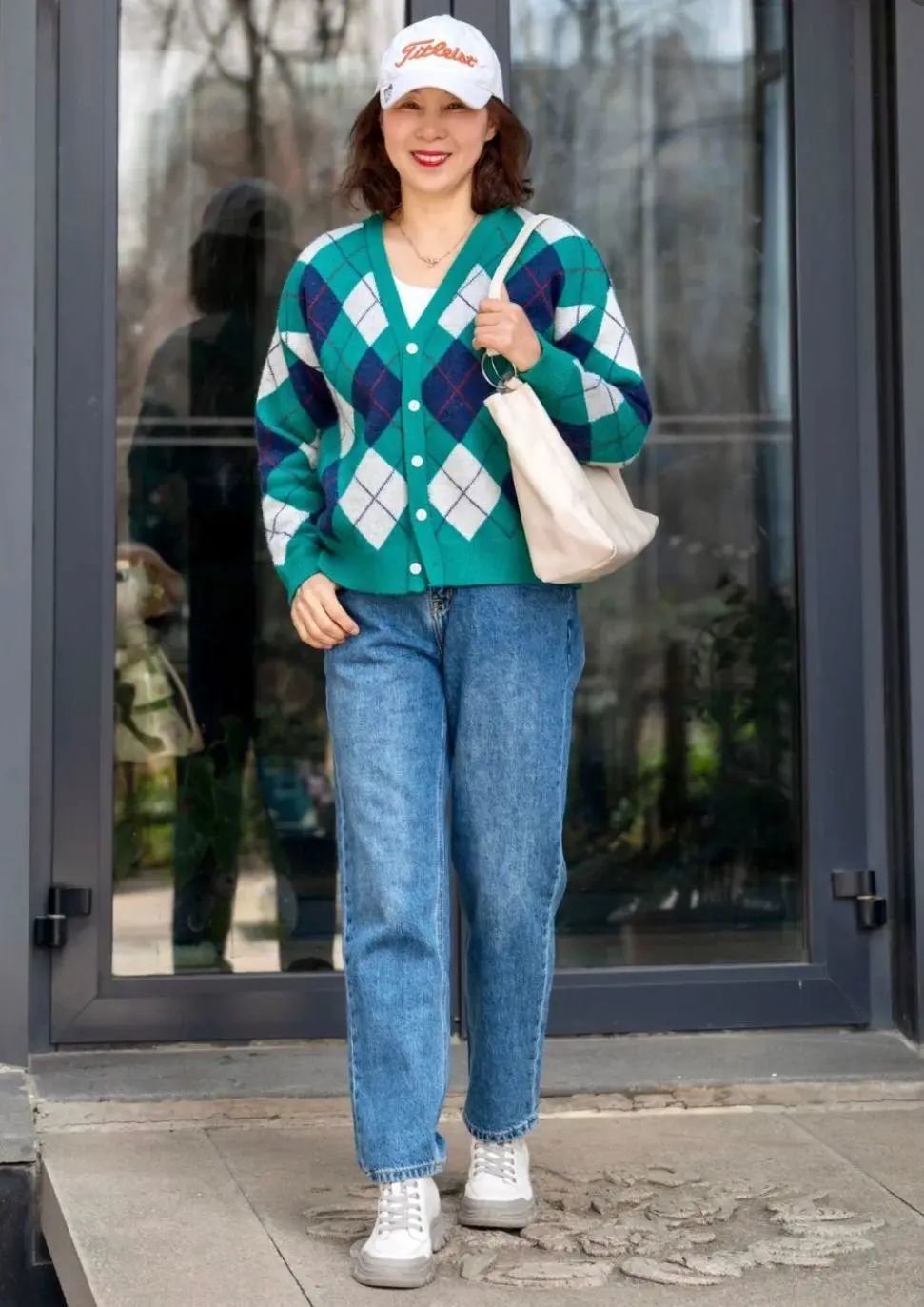 如果说棕色格纹是复古的代表,那么绿色格纹就是将复古和潮流相结合的方式,高饱和度的配色惊艳感十足,不用多余的配饰,也能搭配出高级时髦的效果,上繁下简的穿搭技巧,是日常生活中最普遍的,亮色系洋溢着活力感,所以搭配蓝色高腰牛仔直筒裤,最能够展现出造型优势。