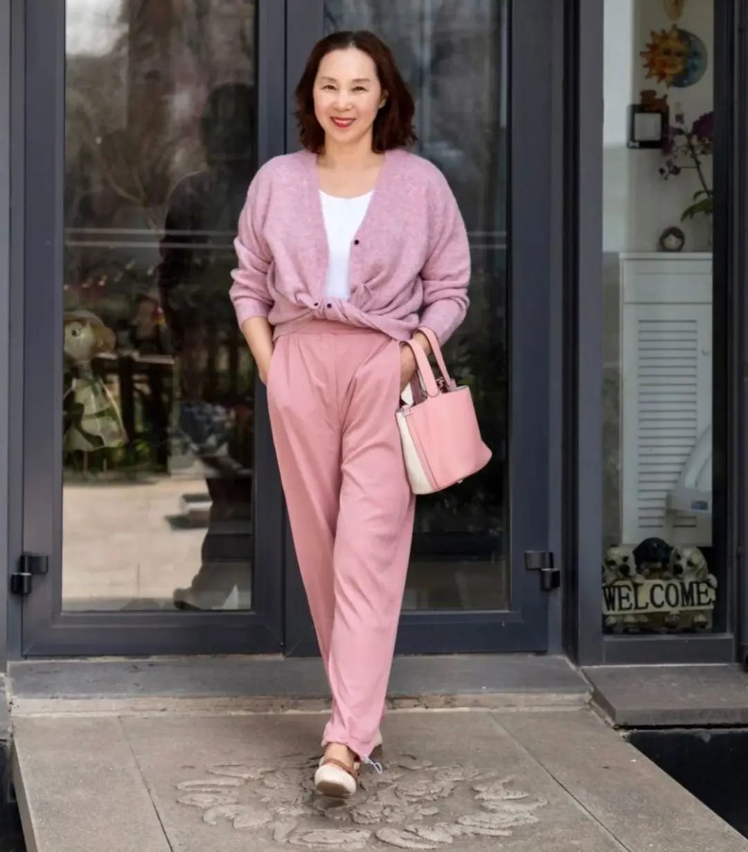 整体采用同色系搭配,强调舒适感和协调效果,不管是亮色系的搭配,还是深色系的搭配,对于微胖奶奶辈儿来说,都是非常显气质的,尤其是深色系搭配,配合上精美的粗细相间的针织开衫,更显女性温柔高雅的一面,同色系搭配也要划分比例高,上身少下身多,是最基本的处理手法,能够很好的塑造三七分比例。