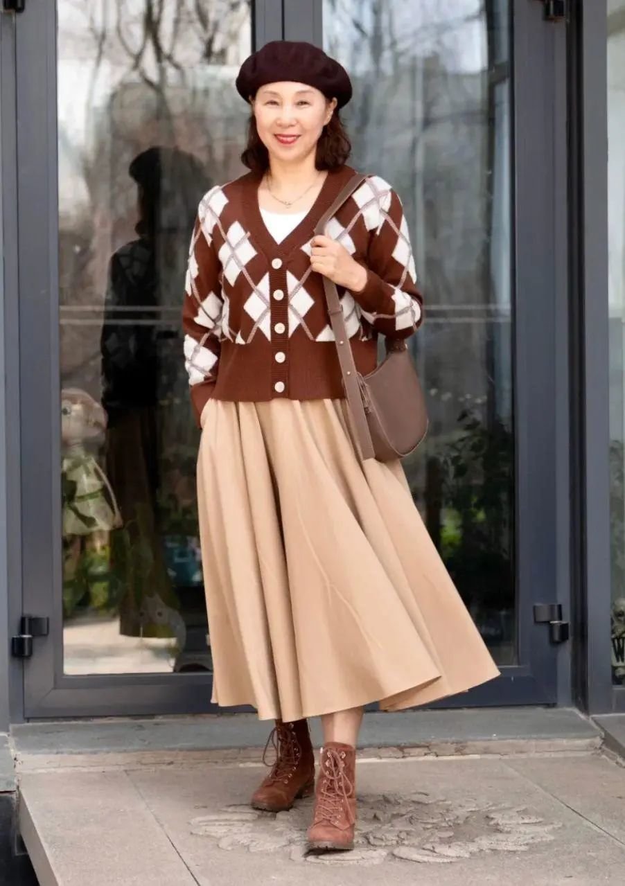 充满着复古气息的格棱开衫,利用V领设计延伸颈部线条美,如果绝对V领有些许暴露,可以叠穿一件吊带或者T恤,也可以搭配上三角丝巾,突出层次感的同时,又散发出端庄大方的气息,棕色格棱开衫,搭配卡其色半身伞裙,不用刻意将开衫塞进腰身,仅仅依靠开衫衣摆处的收腰设计,就能提高腰线。