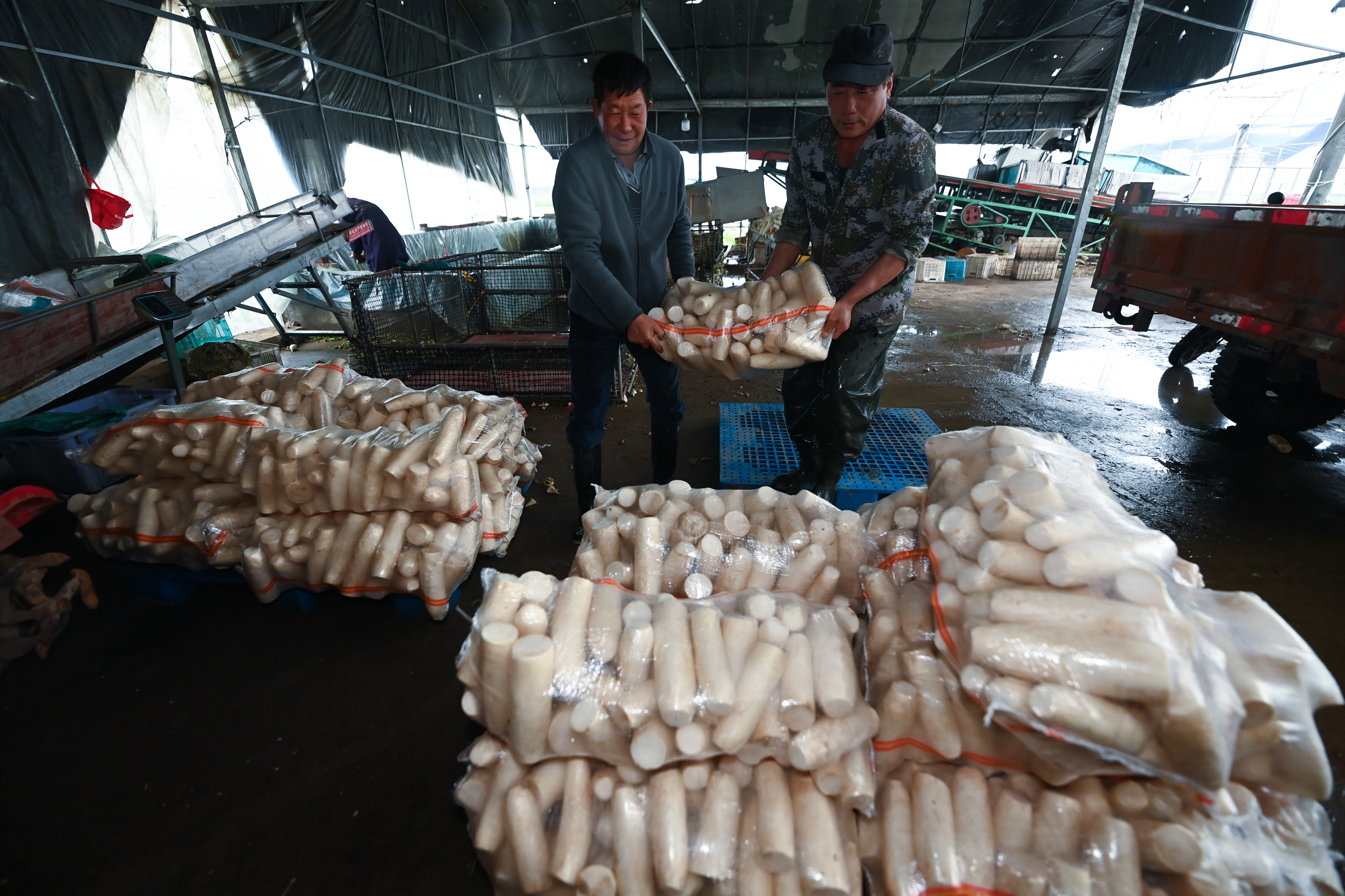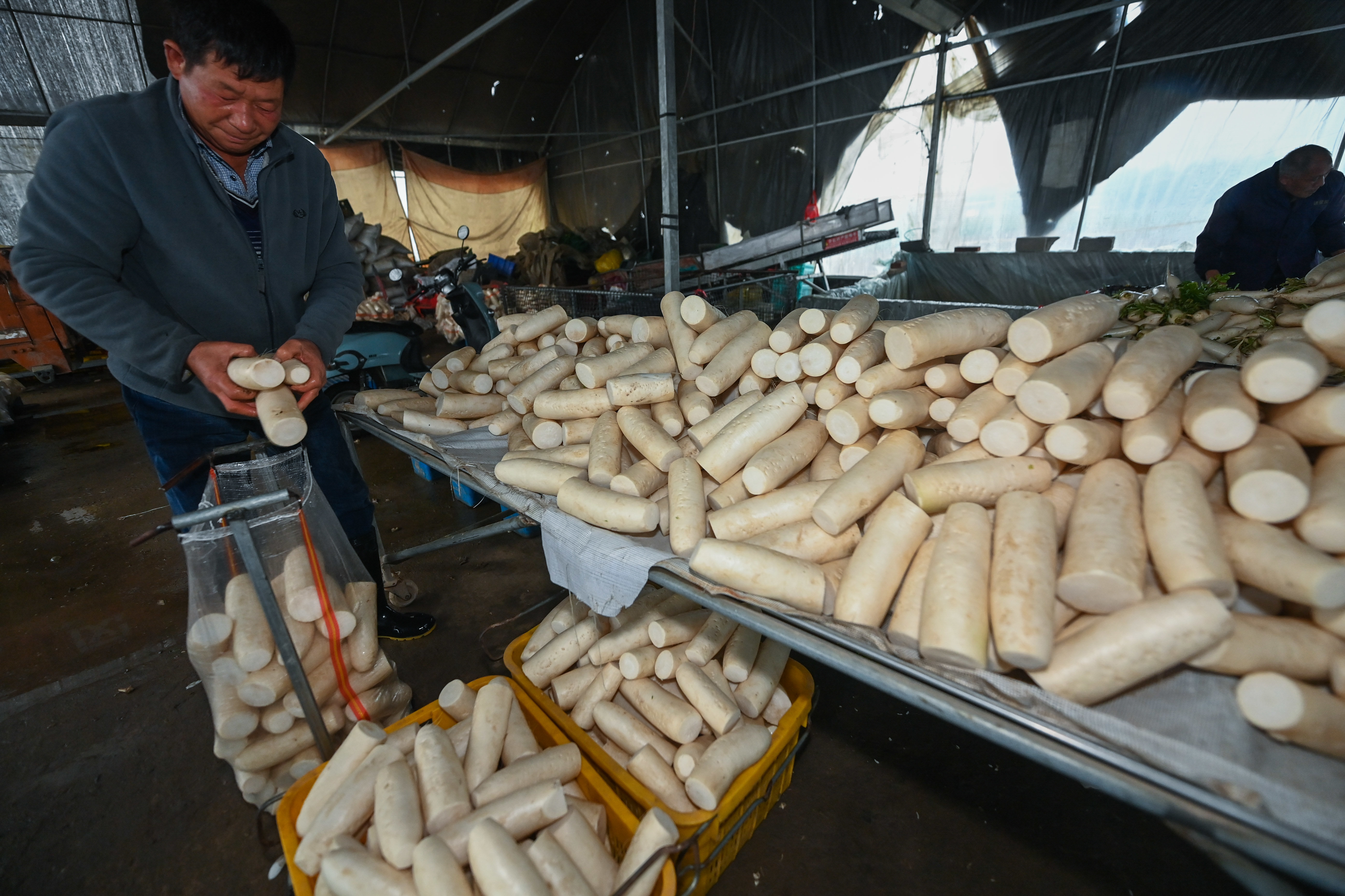 3月23日,基地加工点的工人把采收的萝卜进行清洗、打包。 新华社记者 徐昱 摄