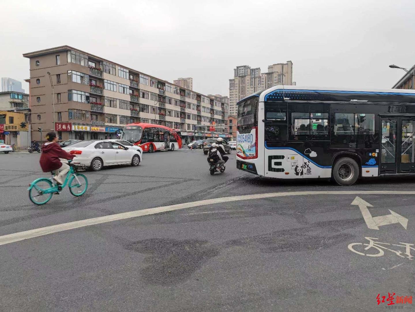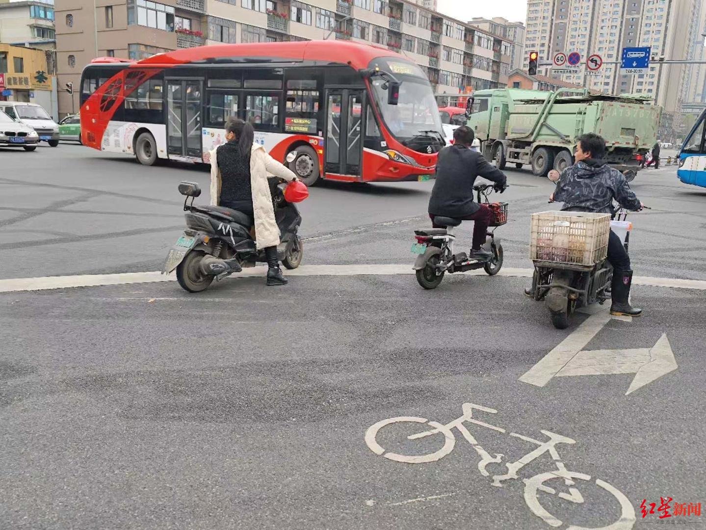 同时,红星新闻记者注意到,除了不佩戴头盔外,部分电动自行车存在违规搭载成年人的行为,因路口有文明劝导员,他们通常在与路口有一定距离时下车、或者经文明劝导员提醒后下车,直到乘坐者步行通过路口后,再坐上电动自行车扬长而去。部分载人的电动自行车驾车者佩戴有头盔,但通常乘坐人员均未戴头盔。在红星新闻记者在路口观察的20分钟内,差不多有七八辆电动自行车违规载人。