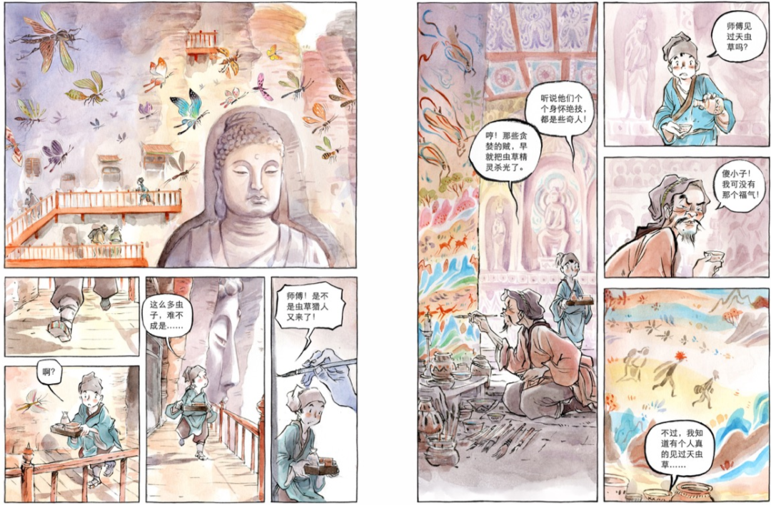 为了《天虫草》,聂峻翻遍了西域丝绸之路的文献资料,吸收了各种古籍、神话小说,画面参考敦煌壁画,做大胆的色彩尝试,尝试构建一个充满想象力的神秘诡谲西域世界。