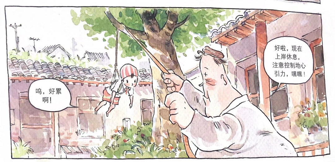《老街的童话》里,孙子鱼儿,没机会学游泳,爷爷就在树上安装了简易的装置。