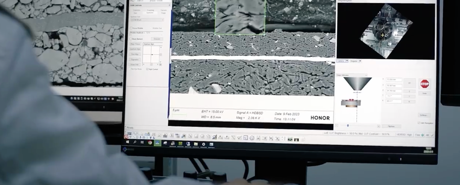 不过电池研发并不只是搞定配方与容量的关系,储存高能以后的电池安全性、充放寿命也是关键技术难点。通过探秘视频了解到荣耀有三套类似“内外科手术”级别的电池研究方式,一种是通过工业CT仪器,用射线穿透电池来查看内部结构在使用过程中是否有异常,相当于给手机拍X光片。