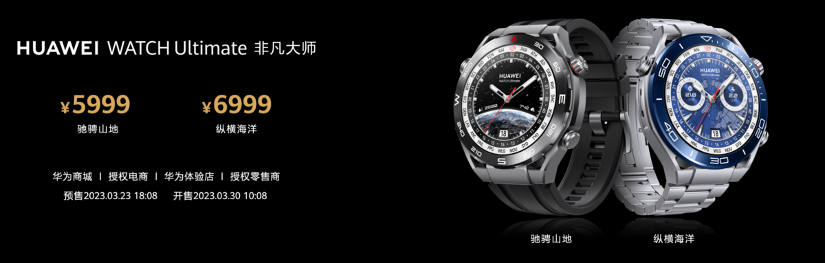 华为WATCH Ultimate非凡大师纵横海洋款版售价为6999元,驰骋山地款版售价为5999元。新品预售时间为 :2023.03.30 10:08 。在2023.03.30 10:08