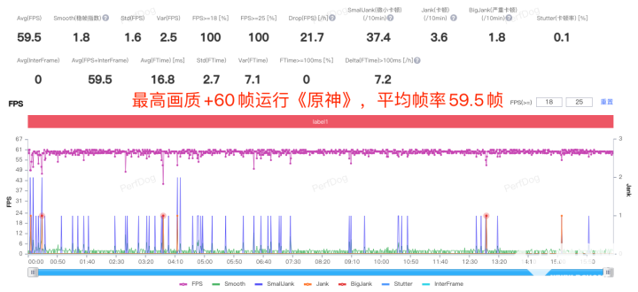 为了检验Find X6的实际游戏表现,我们直接让Find X6运行对手机性能有极高要求的《原神》,开启最高画质,开启60帧,在稻妻三个岛之间跑图、开船、打怪。游戏下来,Find X6平均帧率为59.5帧。