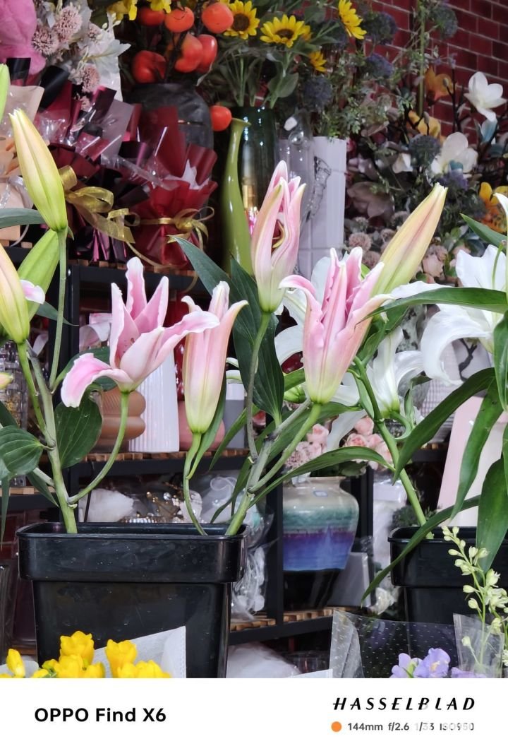 首先,先来看看Find X6这张6倍变焦的花朵样张,拍摄场景为室内强光场景,对比iPhone 14 Pro在同一场景的样张来看,Find X6不仅可以将前景花朵的色彩展现出来,暗处呈现也很有质感,仔细看上方黑色的区域,可以发现,iPhone 14 Pro存在较为明显的涂抹感,而Find X6则异常清澈。