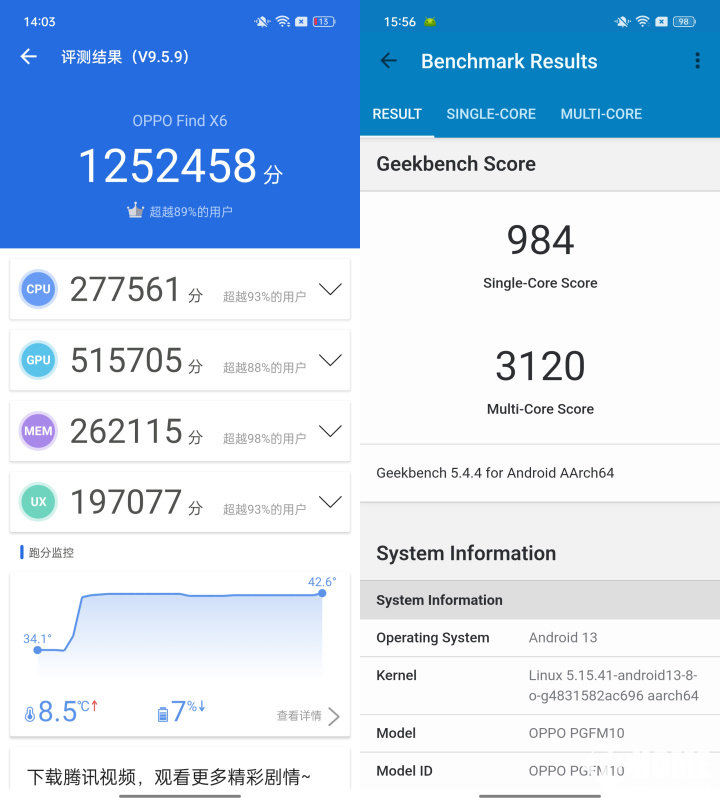 实测Find X6安兔兔跑分超125W分;GeekBench软件单核跑分可以达到984分;多核跑分可以达到3120分。作为对比,此前安兔兔排名第一的手机为搭载骁龙8+ Gen 1处理器的ROG游戏手机6,跑分成绩仅为111万分。从这个角度来看,Find X6的性能,在当今的安卓智能手机行业,无疑已经处于第一梯队。