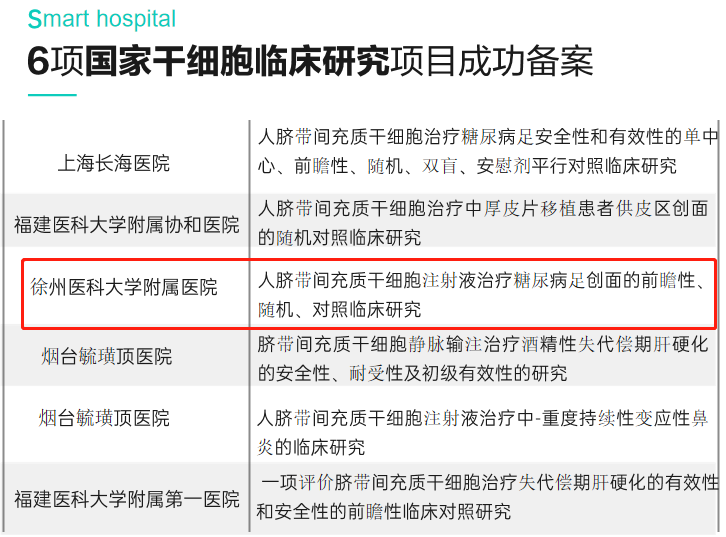 2021年,徐州医科大学附属医院与齐鲁细胞合作的《人脐带间充质干细胞注射液治疗糖尿病足创面的前瞻性、随机、对照临床研究》项目通过国家卫健委备案,并已于2022年3月正式启动,这是全国第一个获批的干细胞治疗糖尿病足研究项目。