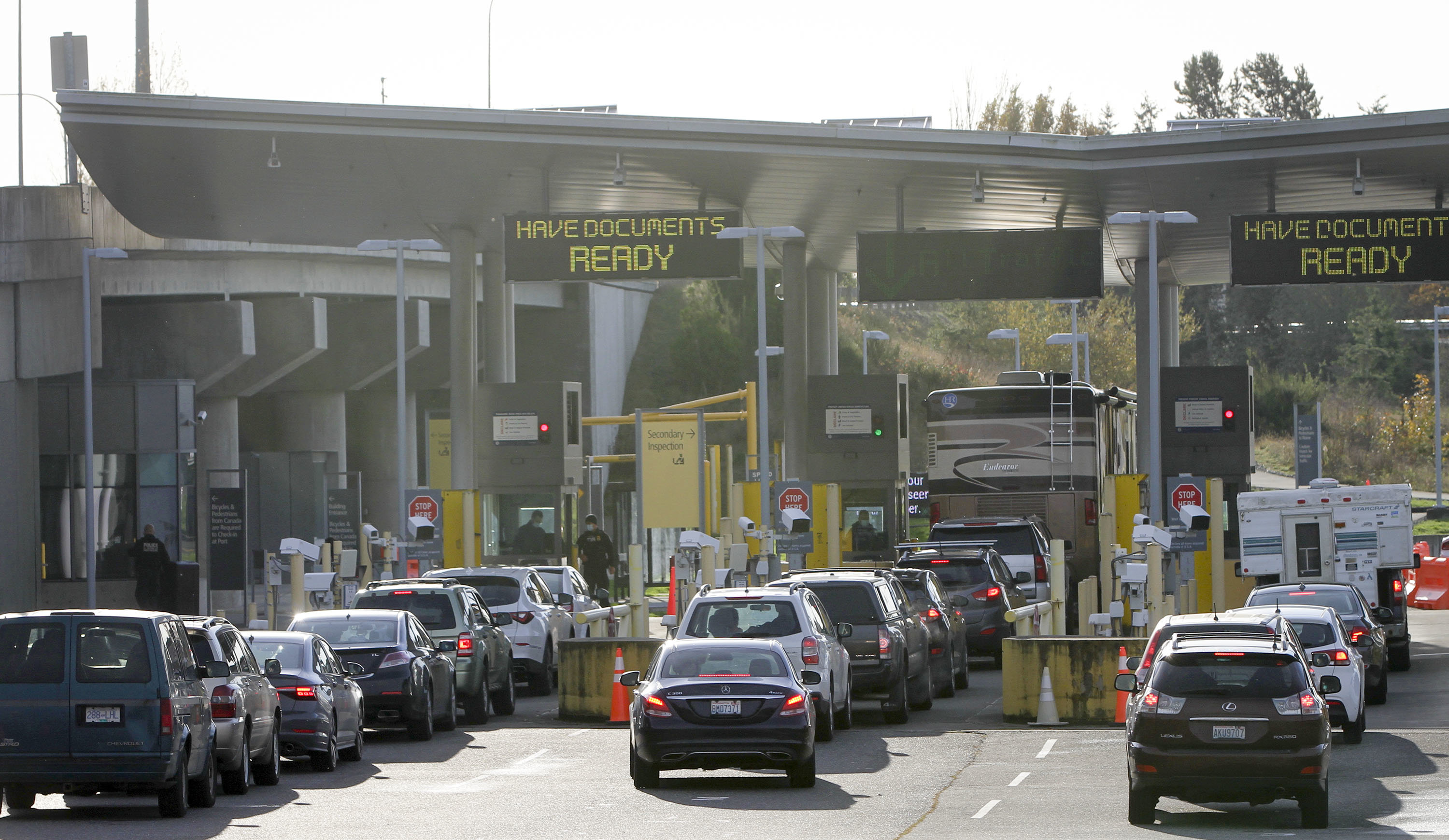 2021年11月8日,在加拿大萨里的加美边境,车辆排队准备驶入美国。新华社发(梁森摄)