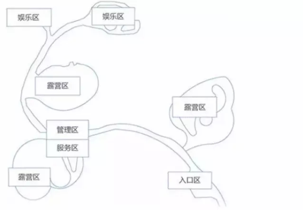 特点:有一条主道路,各个露营区或活动娱乐区都分散布置于主道路两侧。