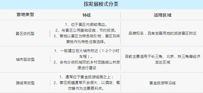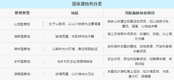按照区位功能可分为都市型营地、近郊型营地、过境型营地、风景区型营地、度假型营地。