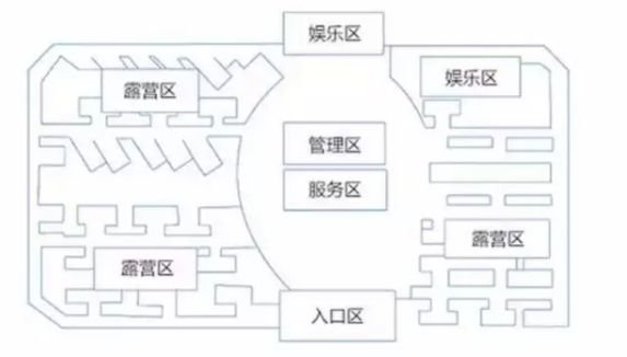 旅游营地根据其类型、自身特色及目标客源市场的消费特征设置有不同的功能区,一般而言,都设有综合服务区、宿营区、休闲娱乐区等。