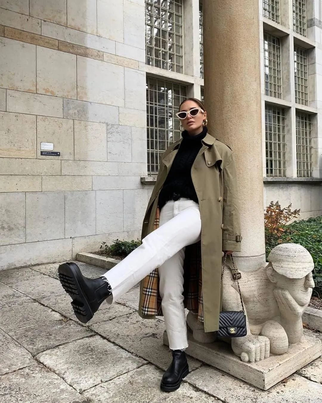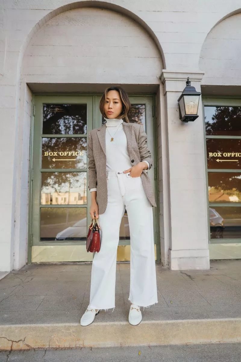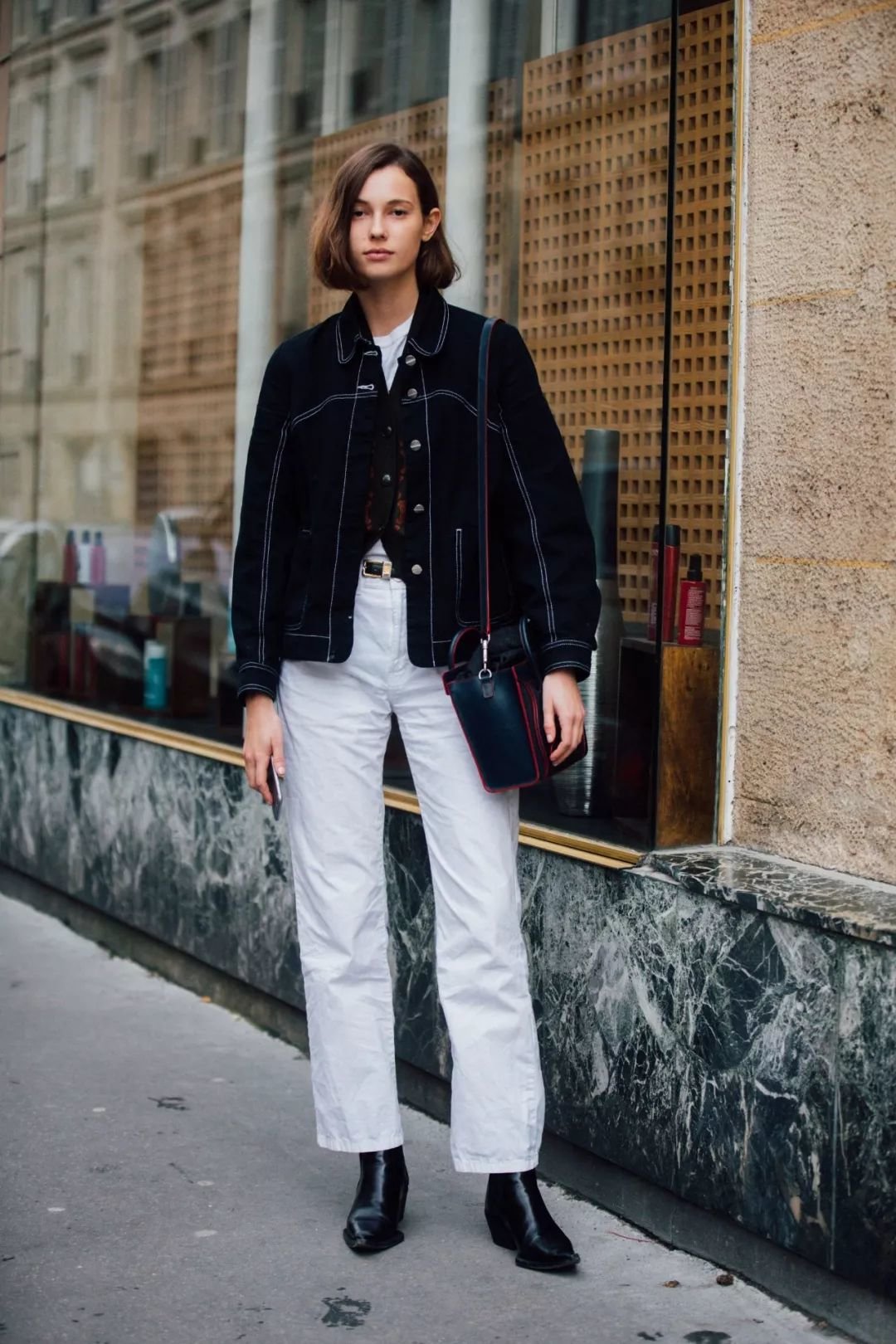 白裤子还有个好处就是,可以中和一些不好驾驭的上衣,还能起到化解造型臃肿感的作用。
