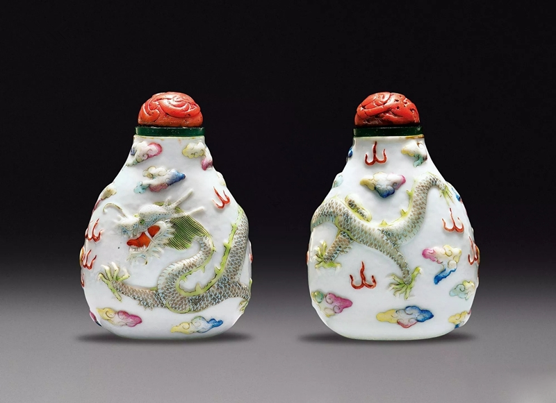 清 “官窑内造”款 浮雕粉彩云龙纹鼻烟壶