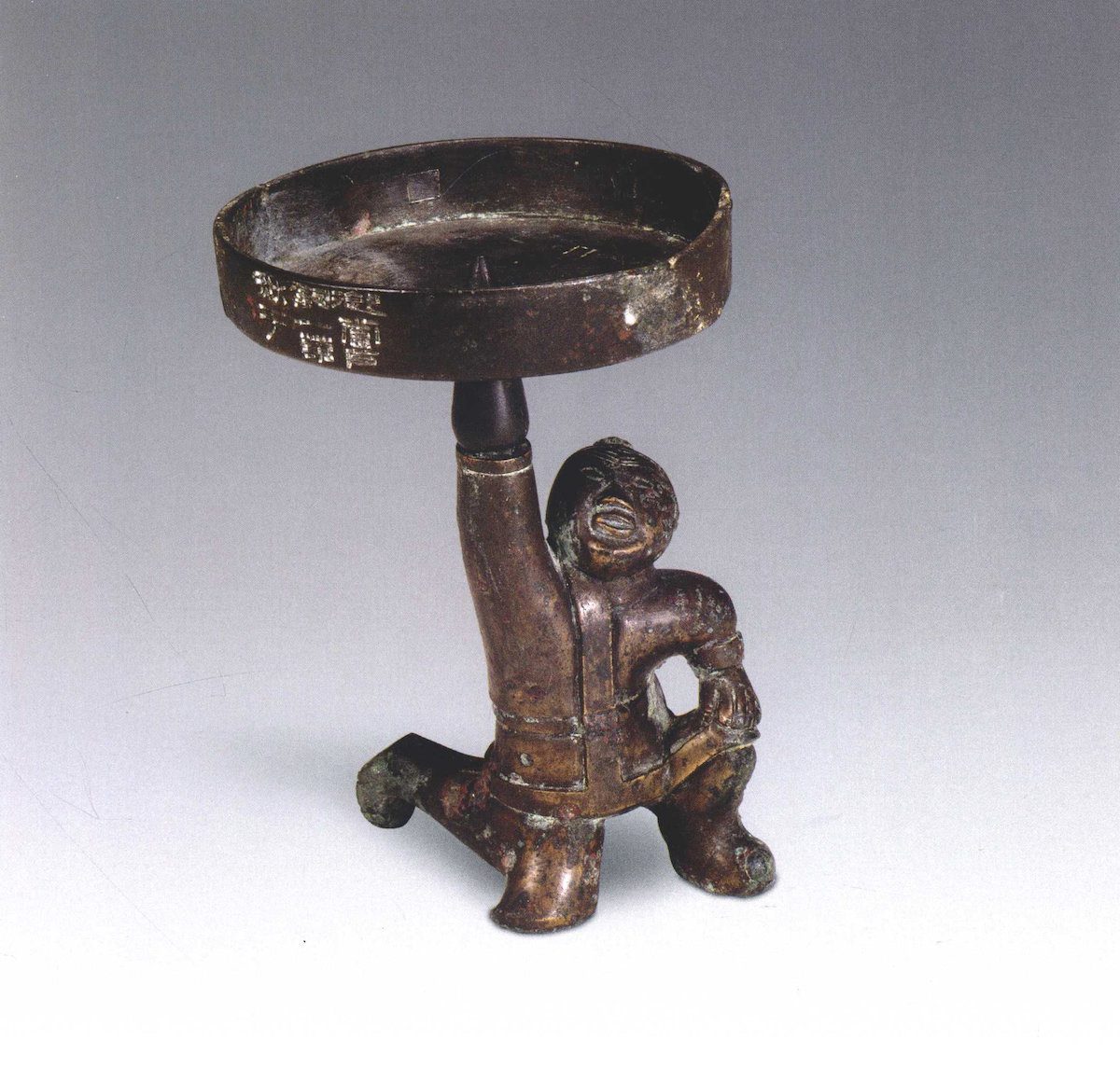 有意思的是,还有一类以人俑为灯座的汉灯见于满城汉墓。该灯名当户铜灯,灯座为一身着直襟短衣,手套臂鞲的匈奴当户形象(当户为匈奴的官名)。当户左手抚膝,右手擎一圆形、直壁灯盘,盘内有烛钎。在诸侯的墓中发现半跪的匈奴形象,也足以反映出当时汉廷与匈奴的关系。俑座灯的灯座多为外族形象,外族或单膝或双膝跪地,头顶或手擎灯盘。这样的灯,陕西、湖南、广东、广西地区多见,且每件均有一定的个性。