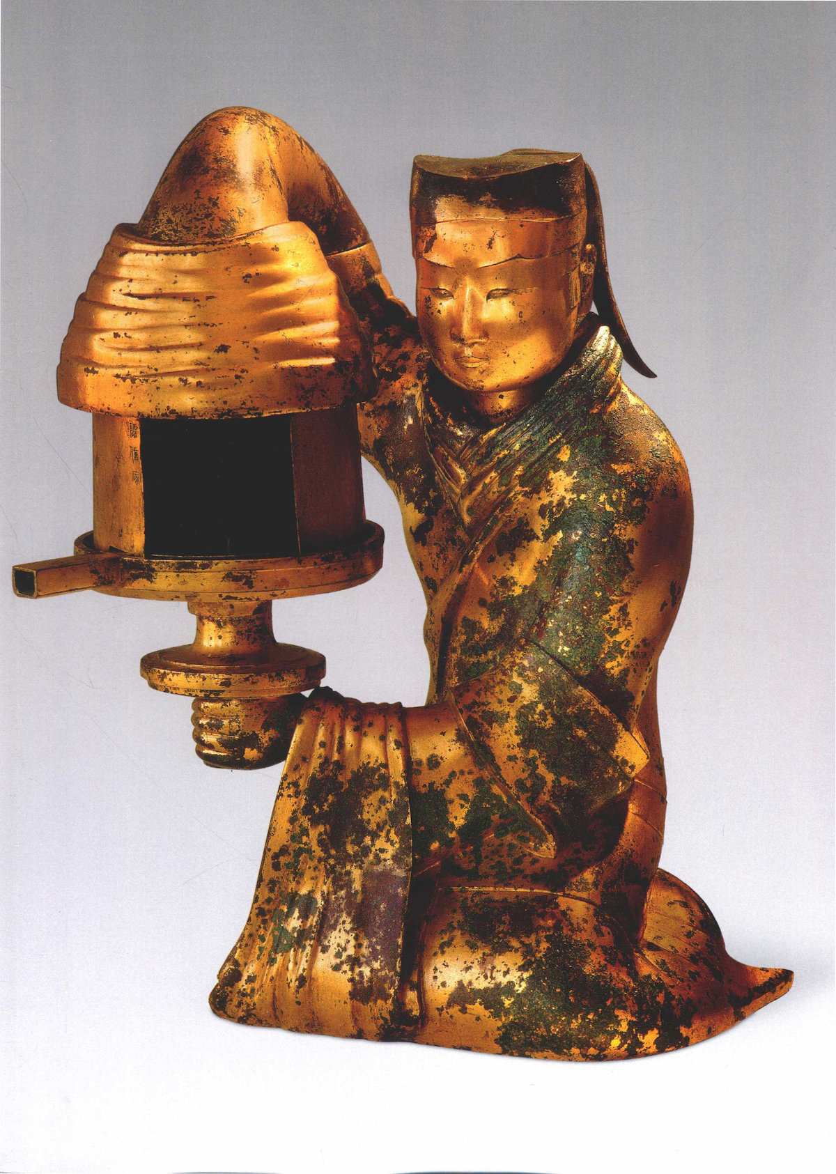 素有“中华第一灯”之誉的长信宫灯,是汉代制灯的巅峰之作。“长信”之名得于灯上的铭文。该灯器身九处铭文计65字,记载了灯的重量、容量与流转信息。这盏制作于约公元前151年的作品,通体鎏金,主体为一跪坐执灯侍女形象,侍女神情恬静,身体内部中空,侍女的头部、身躯、右臂和灯罩、灯盘、灯座均可拆卸,便于清洗组合。最为巧夺天工的是,此灯以侍女衣袖与右臂为通烟管道,将燃烧后的灰烬沉淀于侍女体内,如此一来,燃烧时就不会产生大量污染环境的烟烬。该灯因极为超前的环保意识、巧妙的匠心与丰富的铭文信息,成为目前所见汉灯之最。