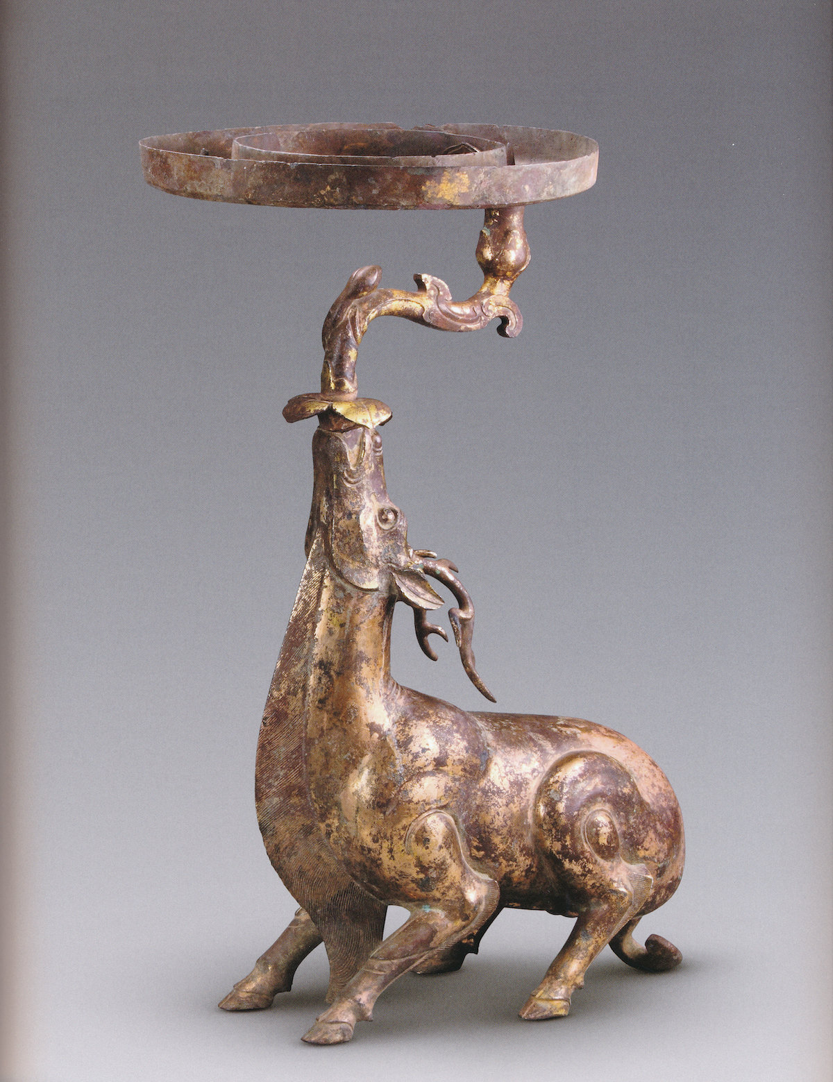 (汉)鎏金铜鹿灯 盘径22.2厘米 盘深2.1厘米 通高45厘米 南京博物院藏
