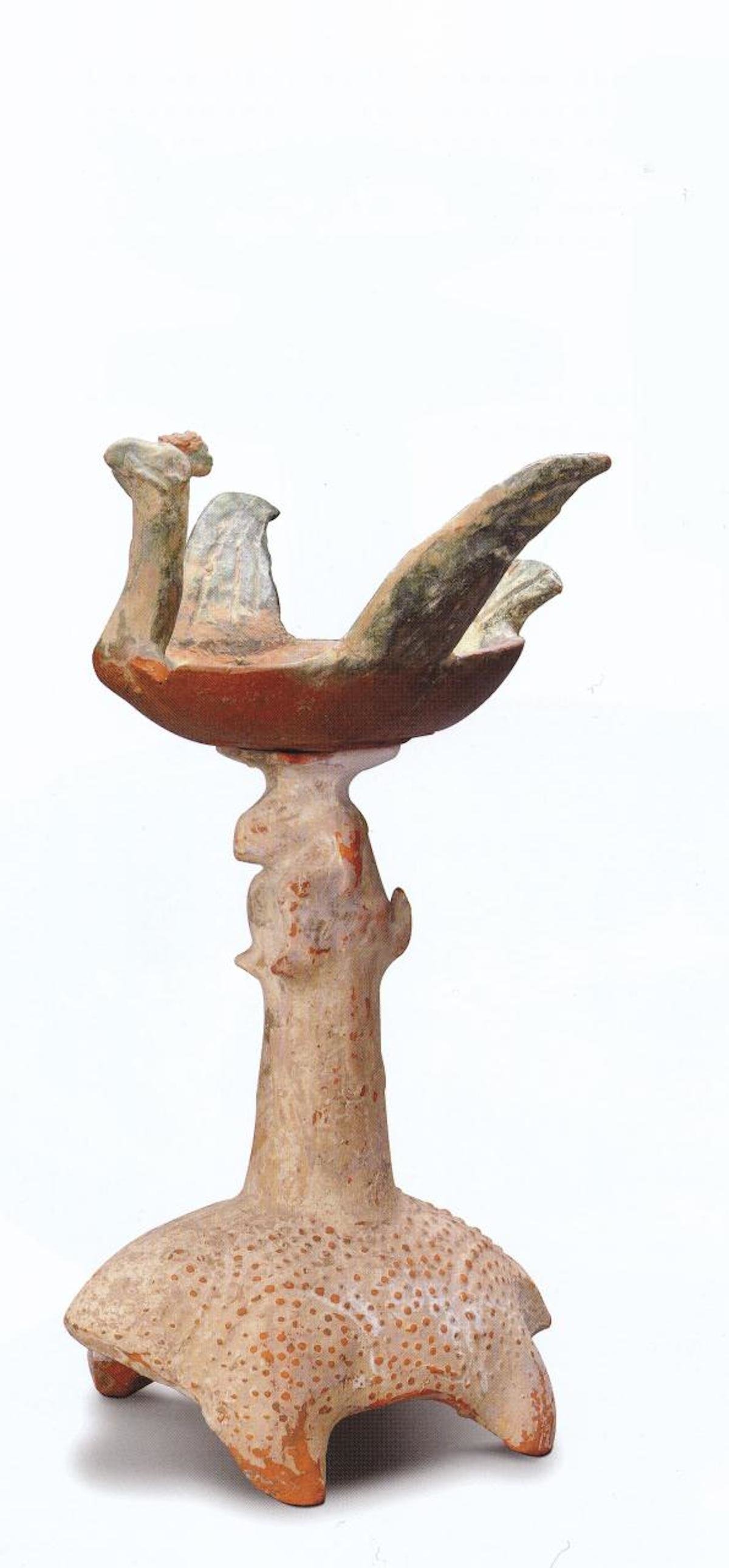 长明、长青是汉人的追求,相较于百花灯的满目繁华,寄托重重,另一类长明灯的寓意则显得更加直接明了:一只憨态可掬的蟾蜍灯座上立一灯柱,灯柱顶端是乖巧的蹲踞状的玉兔,玉兔上方则为一翘首舒羽的金鸟。陶灯红陶质地,红绿釉色施于周身,虽不见富丽之气,却也平添了几分韵味。蟾蜍、玉兔是汉代月亮的象征,金鸟则为太阳,日月相加即为一个“明”字,长明之灯由此得名,朴素的意象组合寄托着平凡的愿景,一灯长明即为凡人之愿。