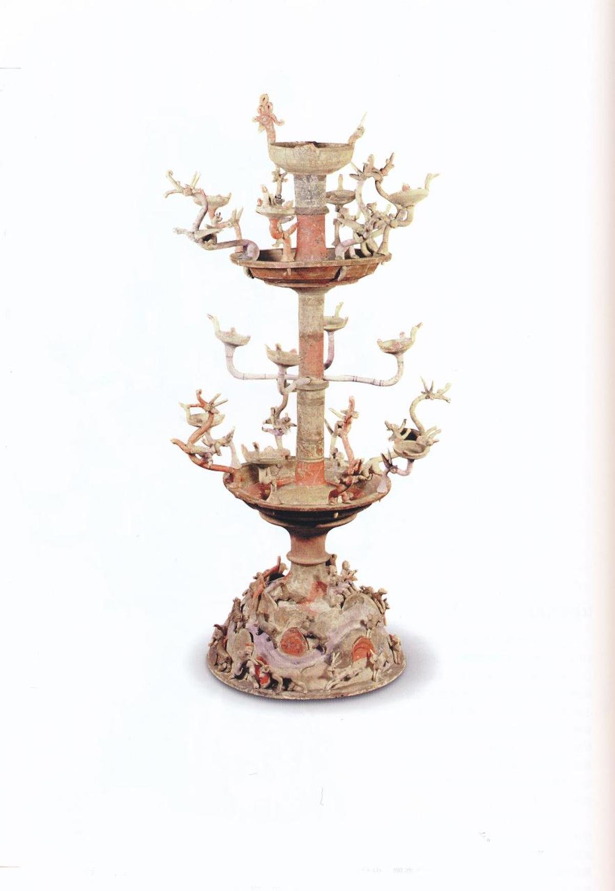 相较于江都王刘非墓中所出的青铜五枝灯的简雅,汉代另有一类多枝灯—百花灯(百枝灯)则显得热闹非凡了。陶百花灯较集中发现于黄河流域,河南、陕西、山西、河北地区多有出土。得益于陶质材料的天性自由,可塑性极强,百花灯的制作充满了各种生机与可能。