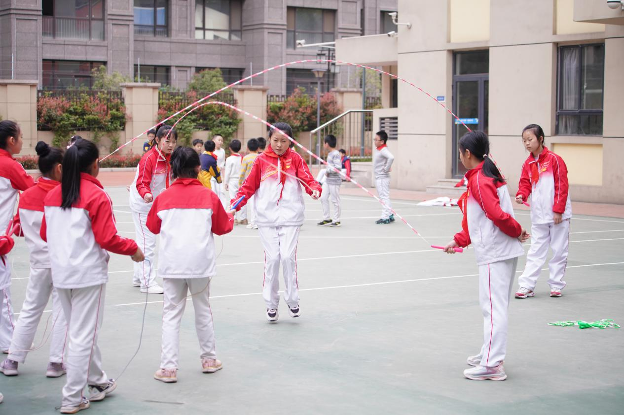 在高新一小梓园校区和西安高新区第十七小学的大课间,还有精彩的花样跳绳活动,小绳、长绳品类繁多,小绳一带一、间隔挽花……长绳十字交叉、竞速跳……瞧,孩子们灵活跃动,分秒必争。五彩的跳绳在空中飞舞,孩子们全神贯注,腾跃穿梭,你追我赶,令人目不暇接。