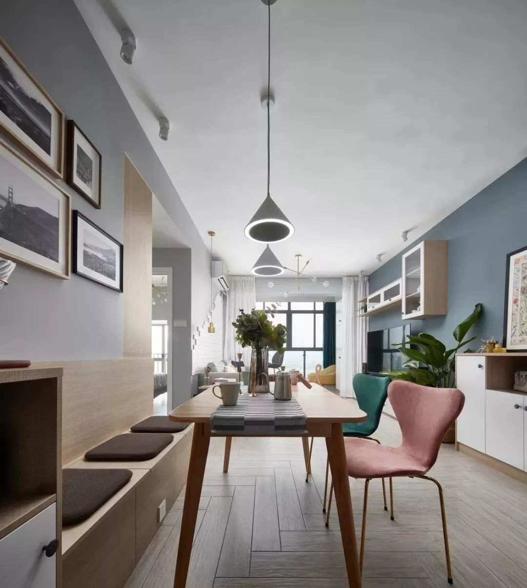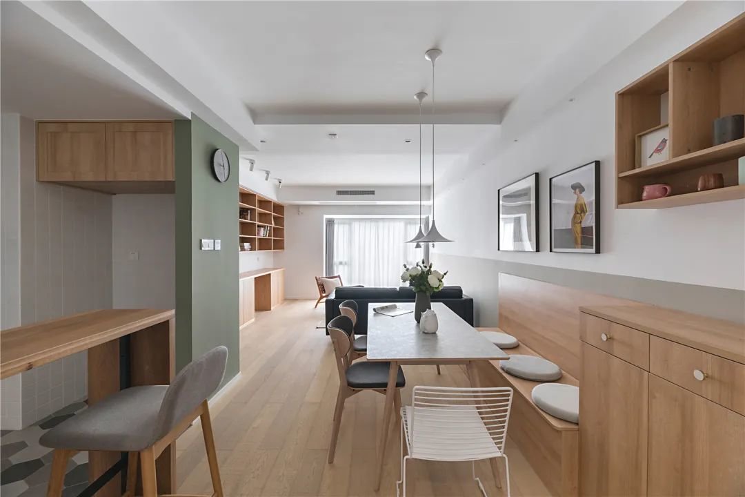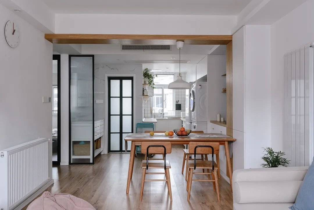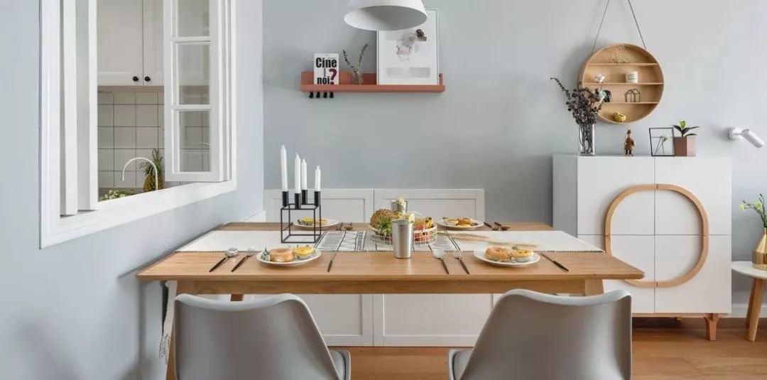也有一些户型没有特别规整和独立的厨房空间,或者厨房墙壁不能打,导致厨房没有办法无法容纳餐桌。这时就可以把餐厅挪到客厅。餐厅和客厅打通之后,可以很大程度上提高视觉上的空阔感。