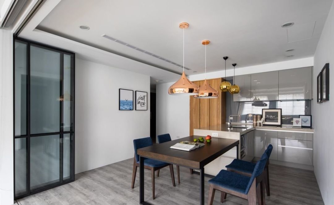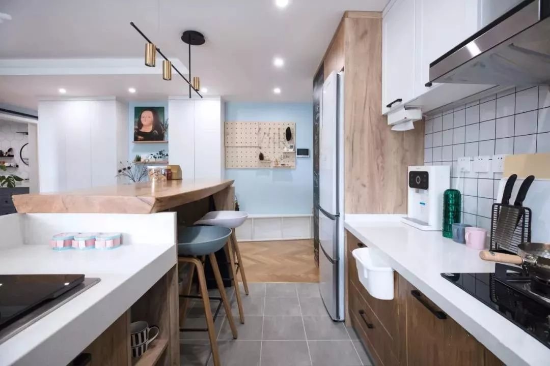 对于一些小户型来说,要么没有独立的餐厅空间,要么餐厅面积很小,可以通过采用开放式厨房或者吧台、卡座的形式,打通餐厅和厨房之间的隔阂,将这两个空间进行一体化设计。