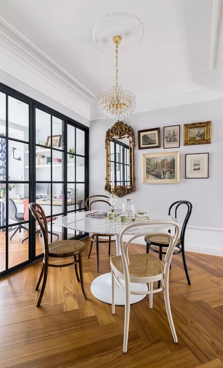 餐桌和餐椅一般都是配套的,不过配套的桌椅不能满足每个家庭成员的口味,而且一模一样的椅子看多了也会有点无聊。这时候就可以通过餐椅混搭的方式,来为餐厅增彩。