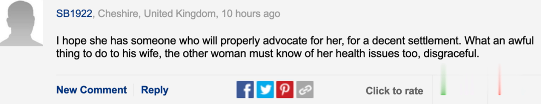 “我希望这妻子身边有人能帮她想办法谈妥一切,丈夫在她生病的时候这么做真是糟糕啊!‘小三’肯定也知道妻子的情况,太渣了!”