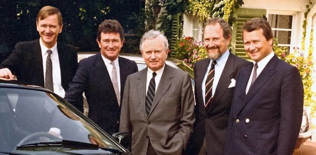 (从左至右:舅舅费利·保时捷、费迪南德·皮耶希、汉斯·皮耶希、布兹·保时捷)